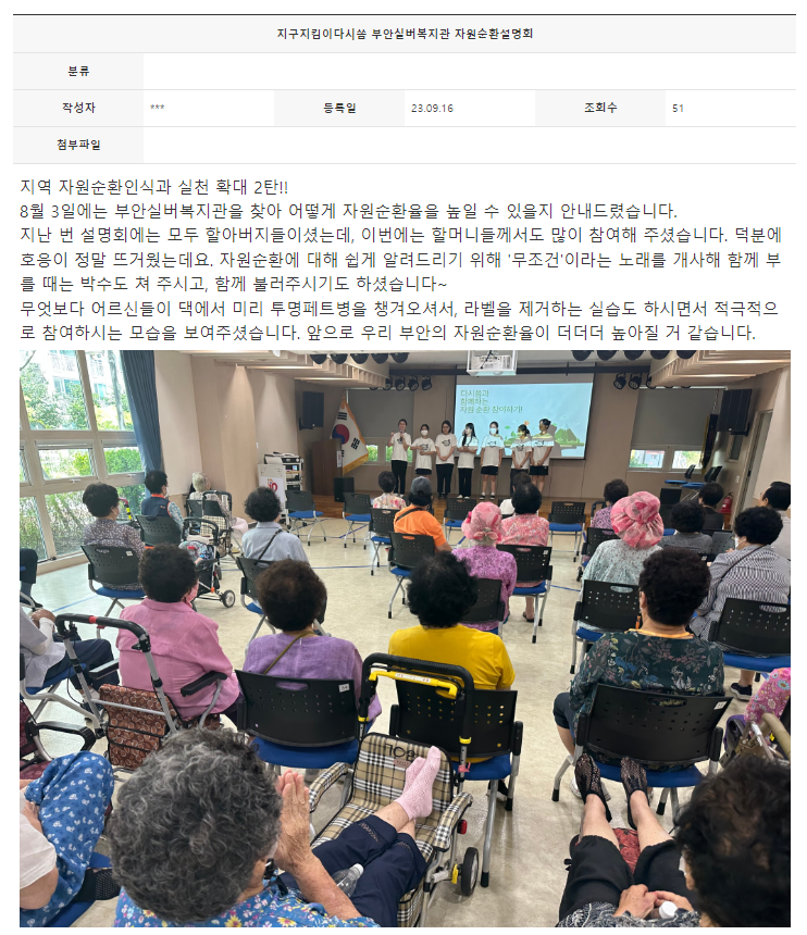 8월 3일에는 부안실버복지관을 찾아 어떻게 자원순환율을 높일 수 있을지 안내드렸습니다.