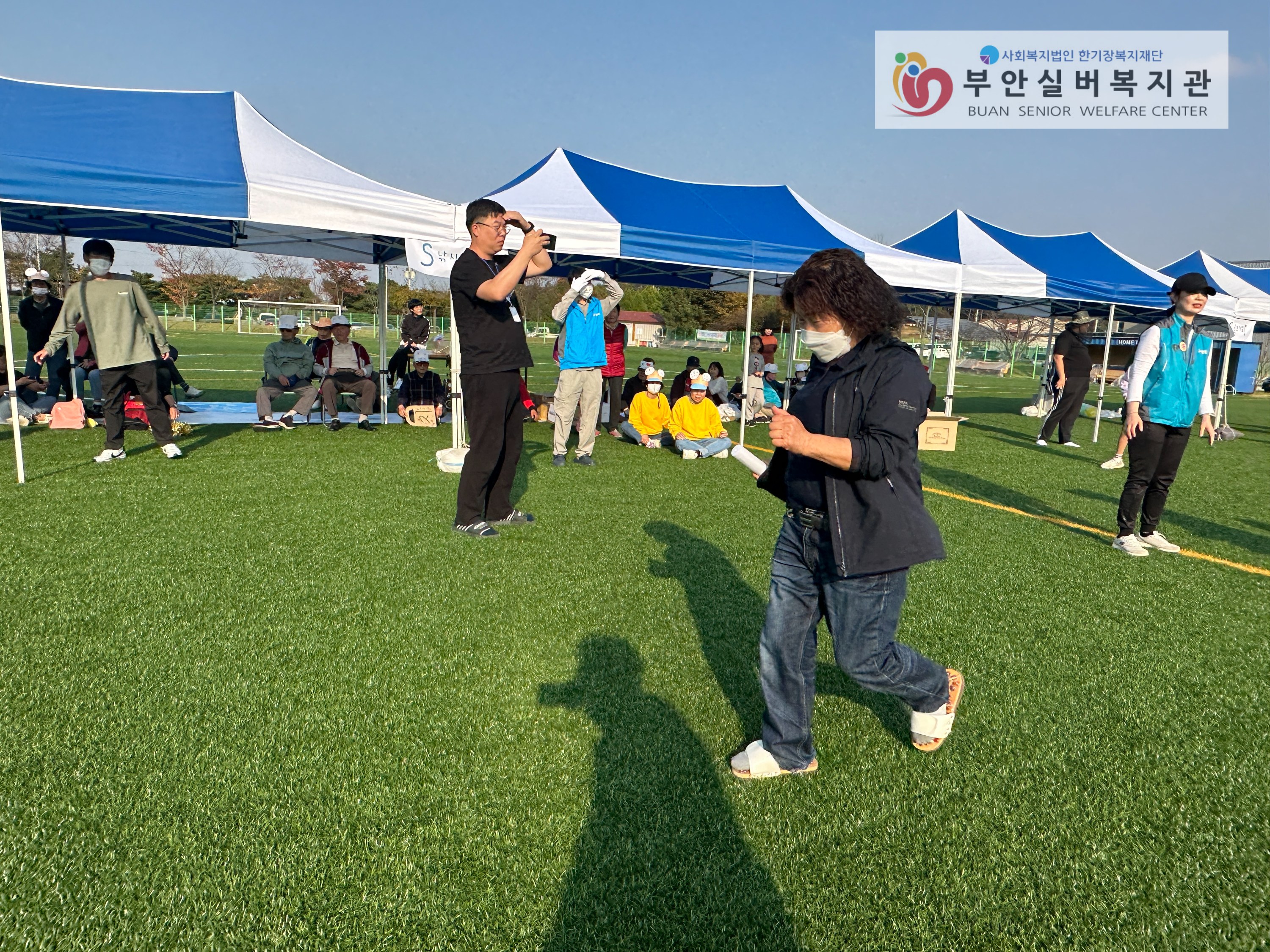 미니 체험부스로 플라스틱 물통을 맞춰라, 환경사격게임, 우리는 환상의 짝꿍, 협동의 컵 쌓기, 튕겨 튕겨 계란판 탁구공 등의 다양한 게임에 참여하셨고, 부스에 참여하기 어려운 어르신들은 줄포난타팀 -하울링, 아랑고고장구, 한국연예예술인협회 부안지회, 청년마술연합회의 공연을 보며 즐거운 시간을 보내셨습니다. 명랑운동회에 맞게 단체게임으로 OX퀴즈, 릴레이 미션 계주를 마무리하며, 내년에도 건강한 모습으로 다시 참여하시길 약속하셨습니다!