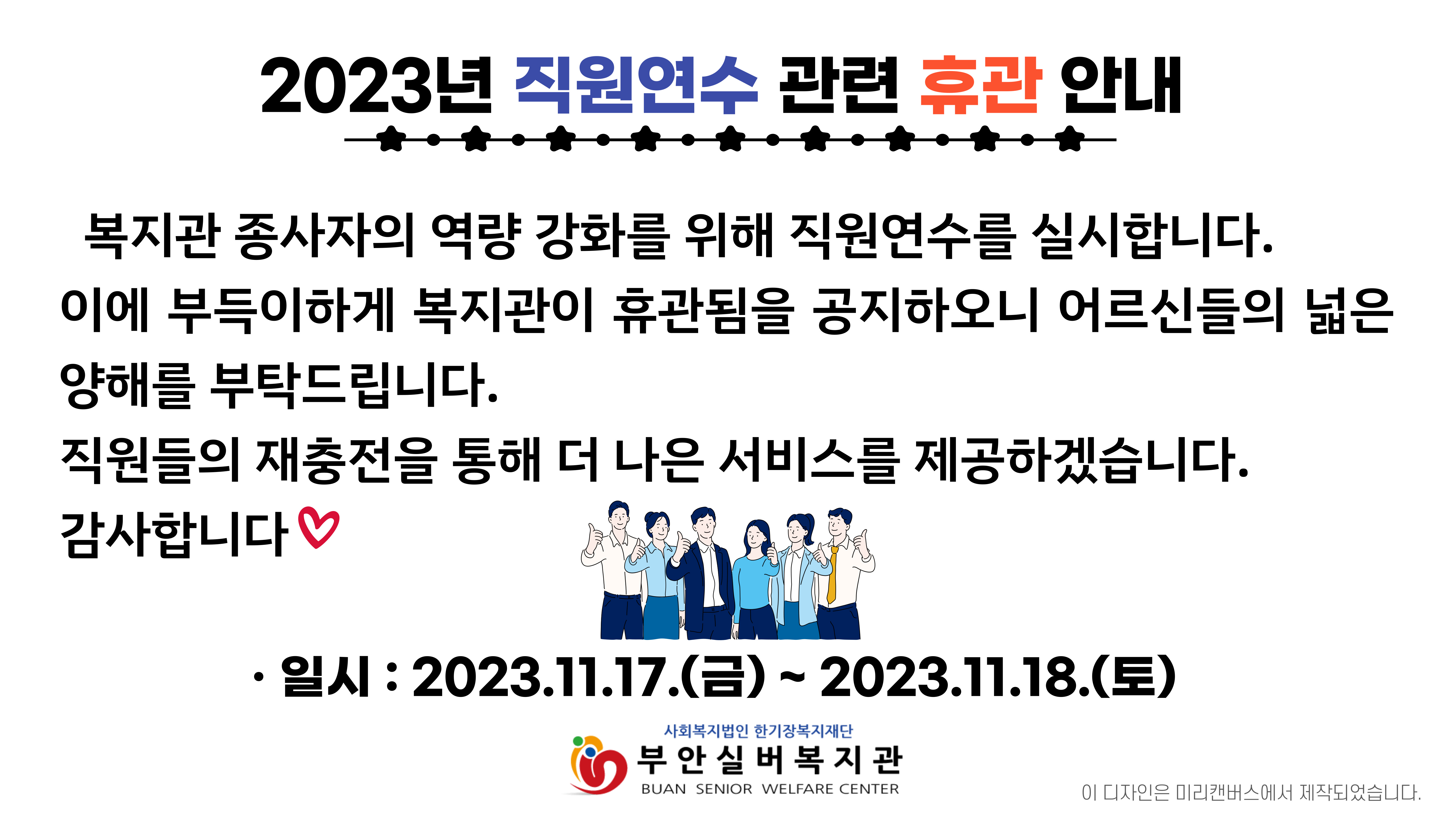 | [마감] 2024년 부안실버복지관 (동계) 사회복지현장실습생 모집 (0) | 2023.11.30 |