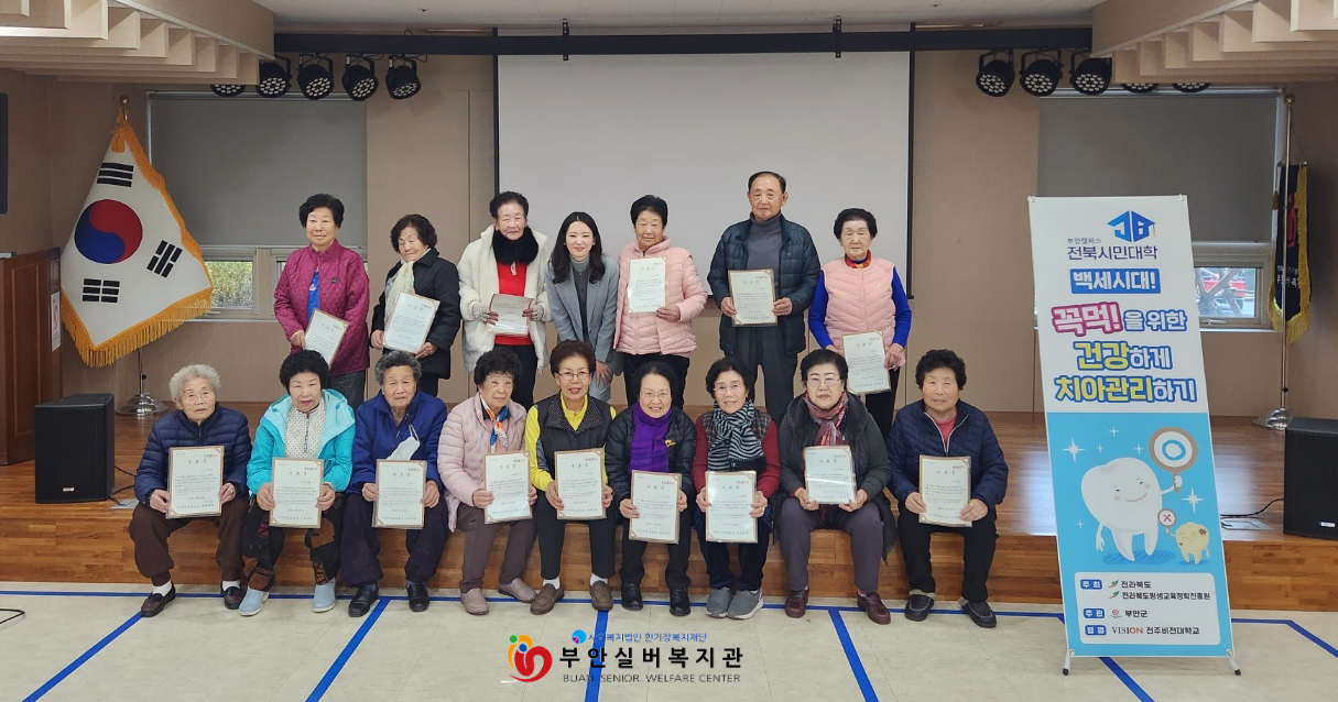 노년기 건강관리의 중요성, 구강건강의 중요성과 관리법이라는 주제로 어르신과 함께 유익한 시간을 보낼 수 있게 도움주신 전주 예수대학교비전대학교 교수님과 전북시민대학 부안캠퍼스 담당 선생님께 다시한번 감사드립니다.