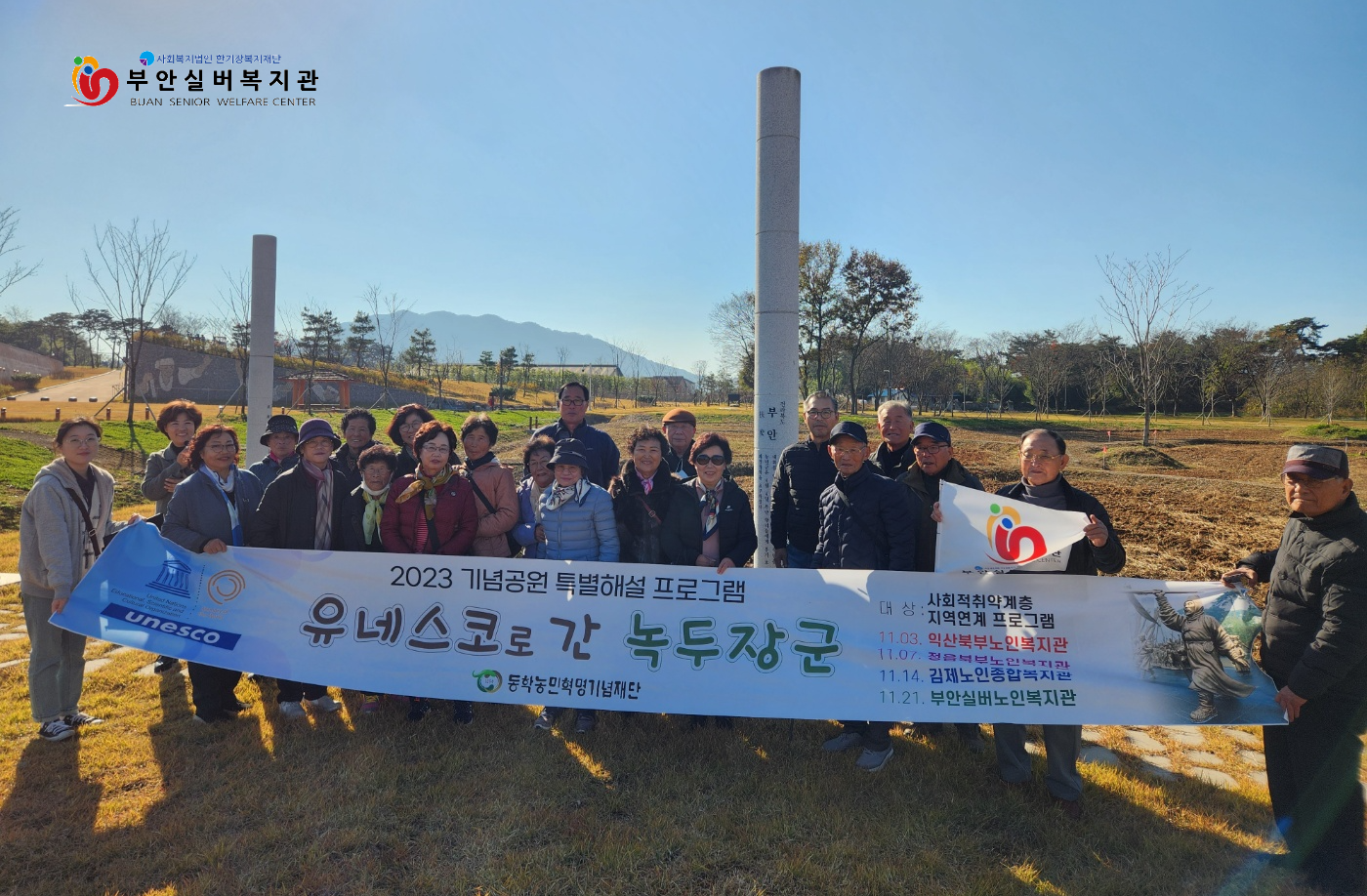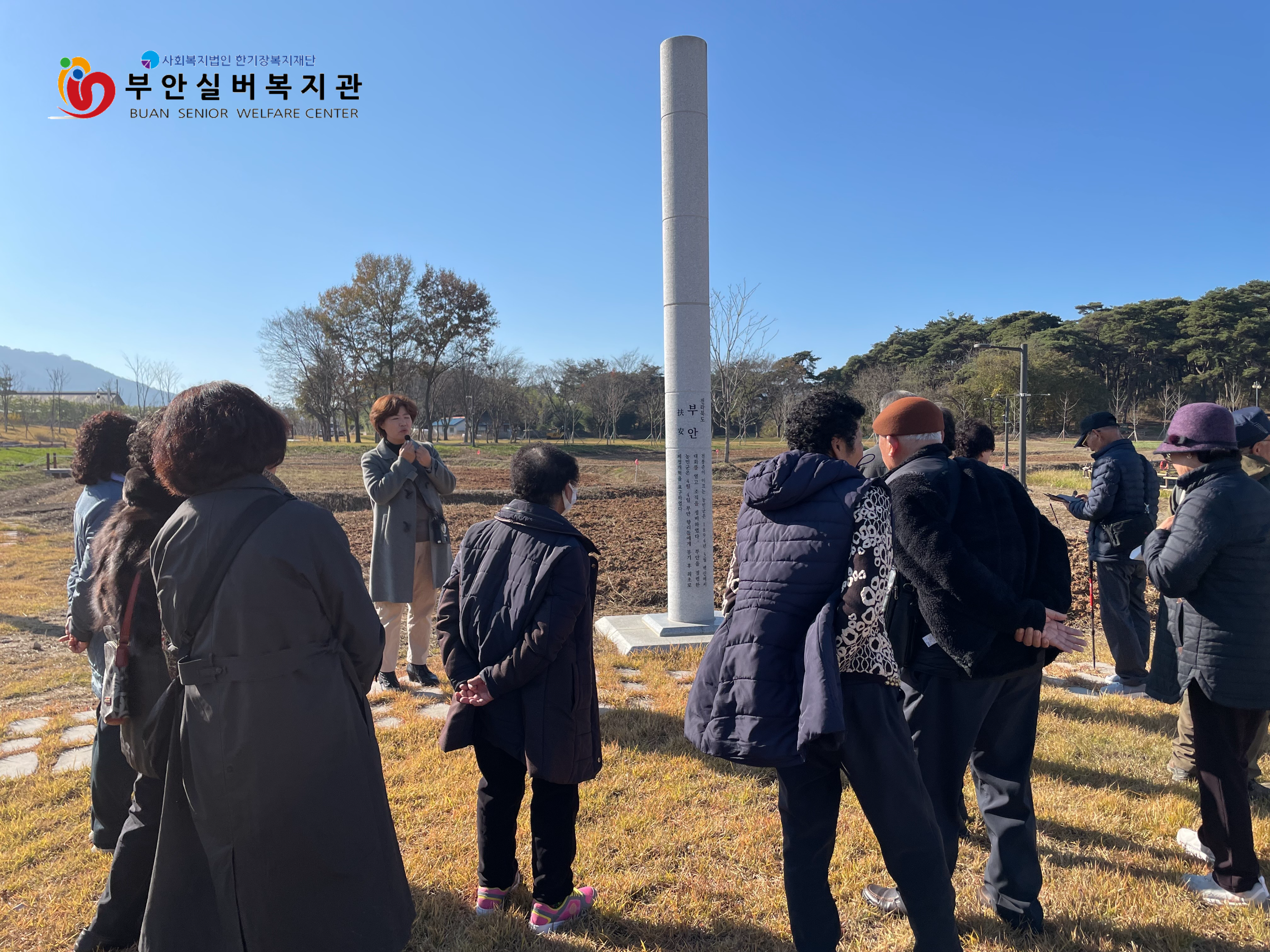 올 한 해 피트니스실에서 자원봉사 활동해 주신 어르신들, 노인복지관 연계사업 경로당 프로그램에 적극적으로 참여해 주신 농원마을, 대포마을, 신성마을 어르신들이 따뜻한 날씨에 산책하며 재충전하는 시간이 되었으리라 생각합니다. 내년에도 건강한 모습으로 복지관과 함께 활동하실 수 있기를 바랍니다. 또한 어르신들의 눈높이에 맞도록 재미있고 알찬 해설을 진행해 주신 동학농민혁명기념재단 최은희 선생님께 감사드립니다.