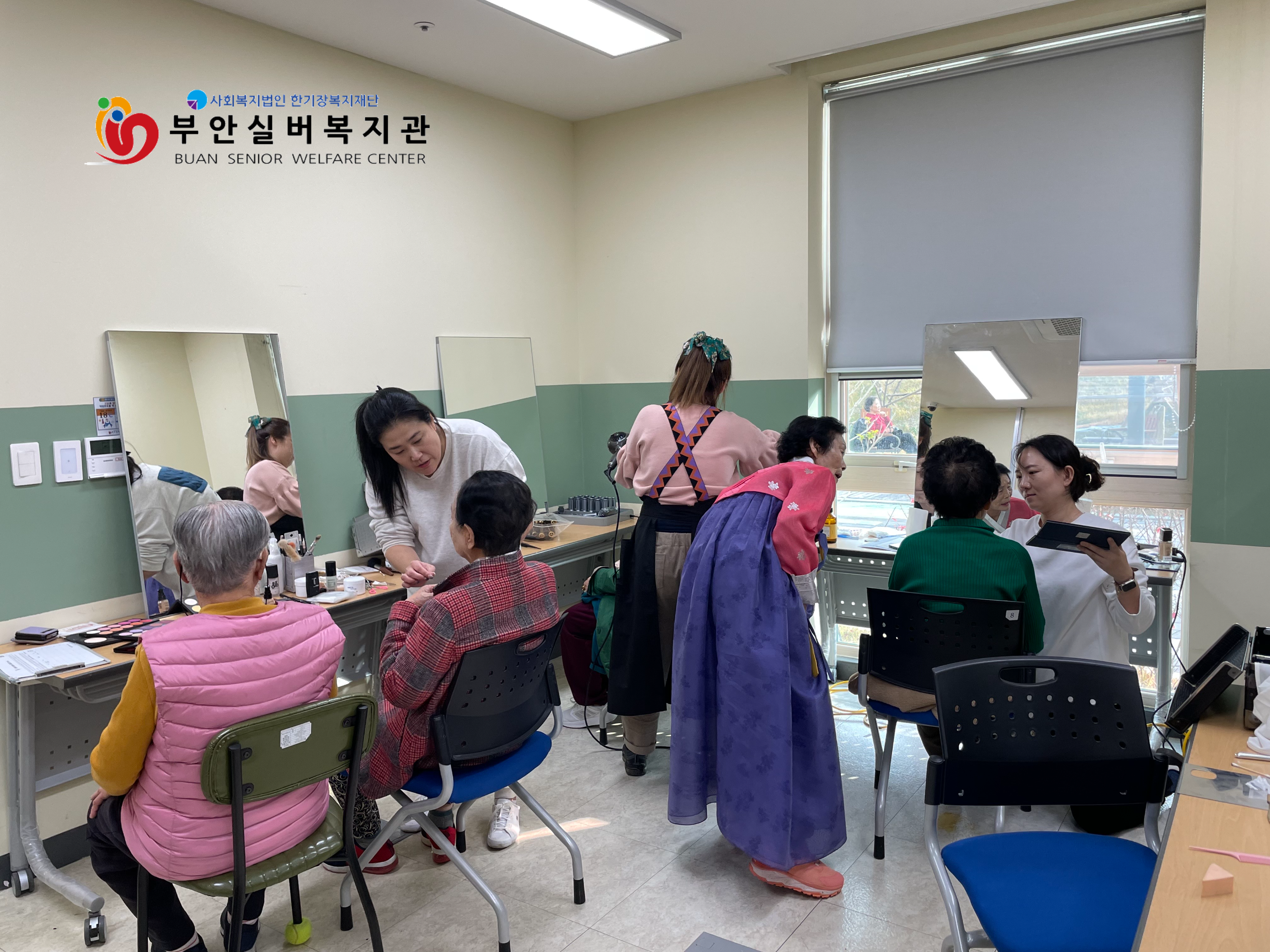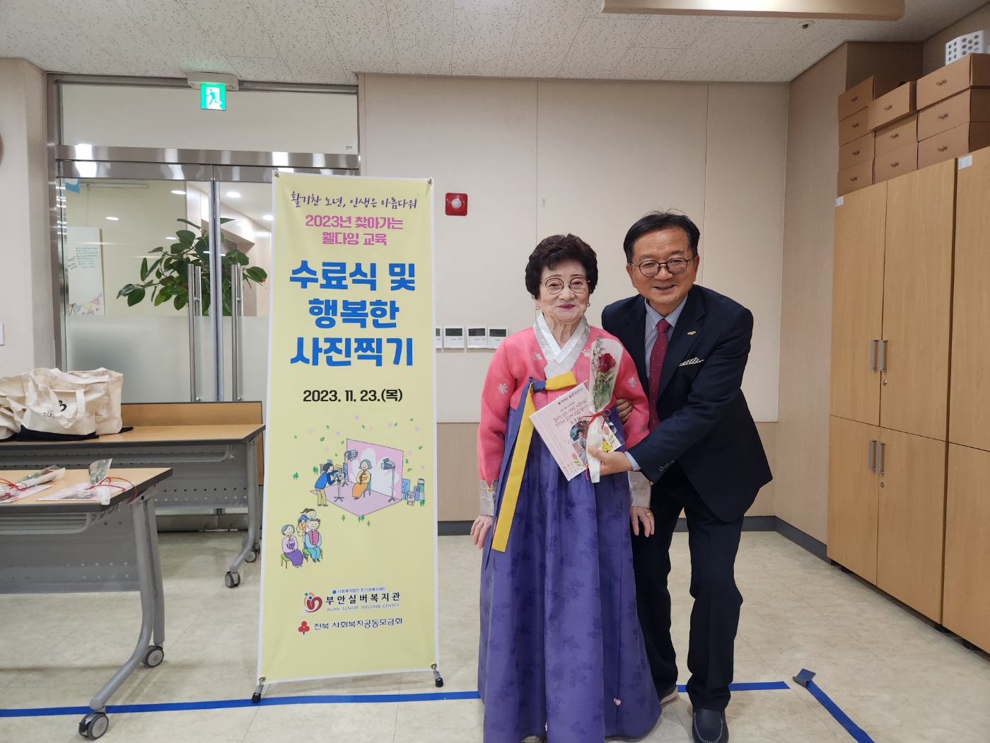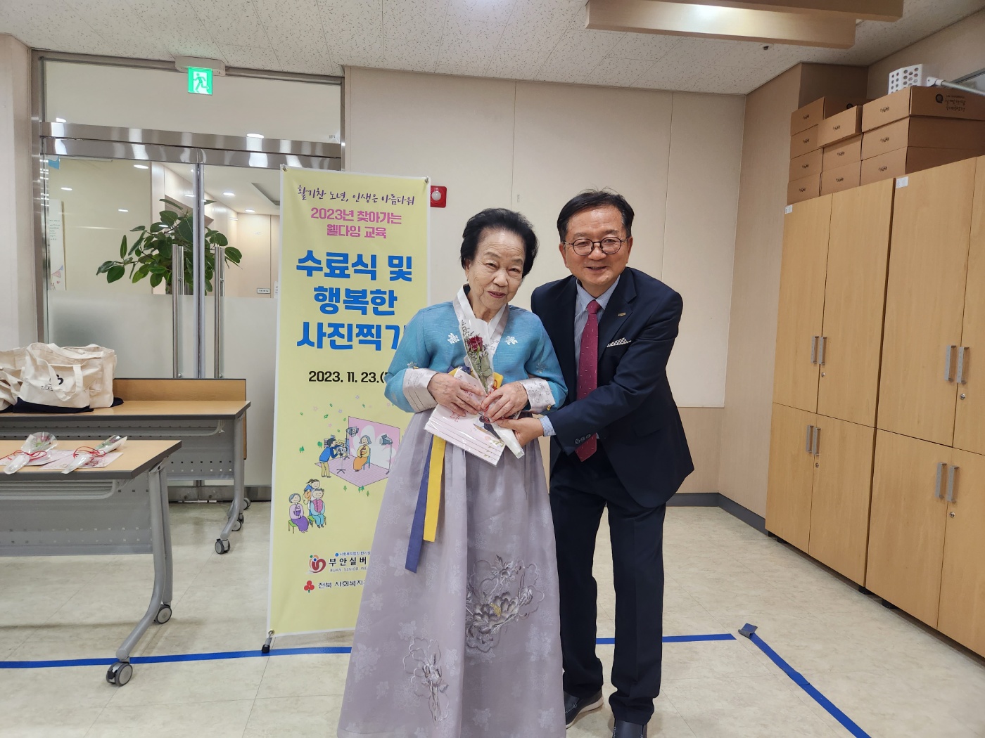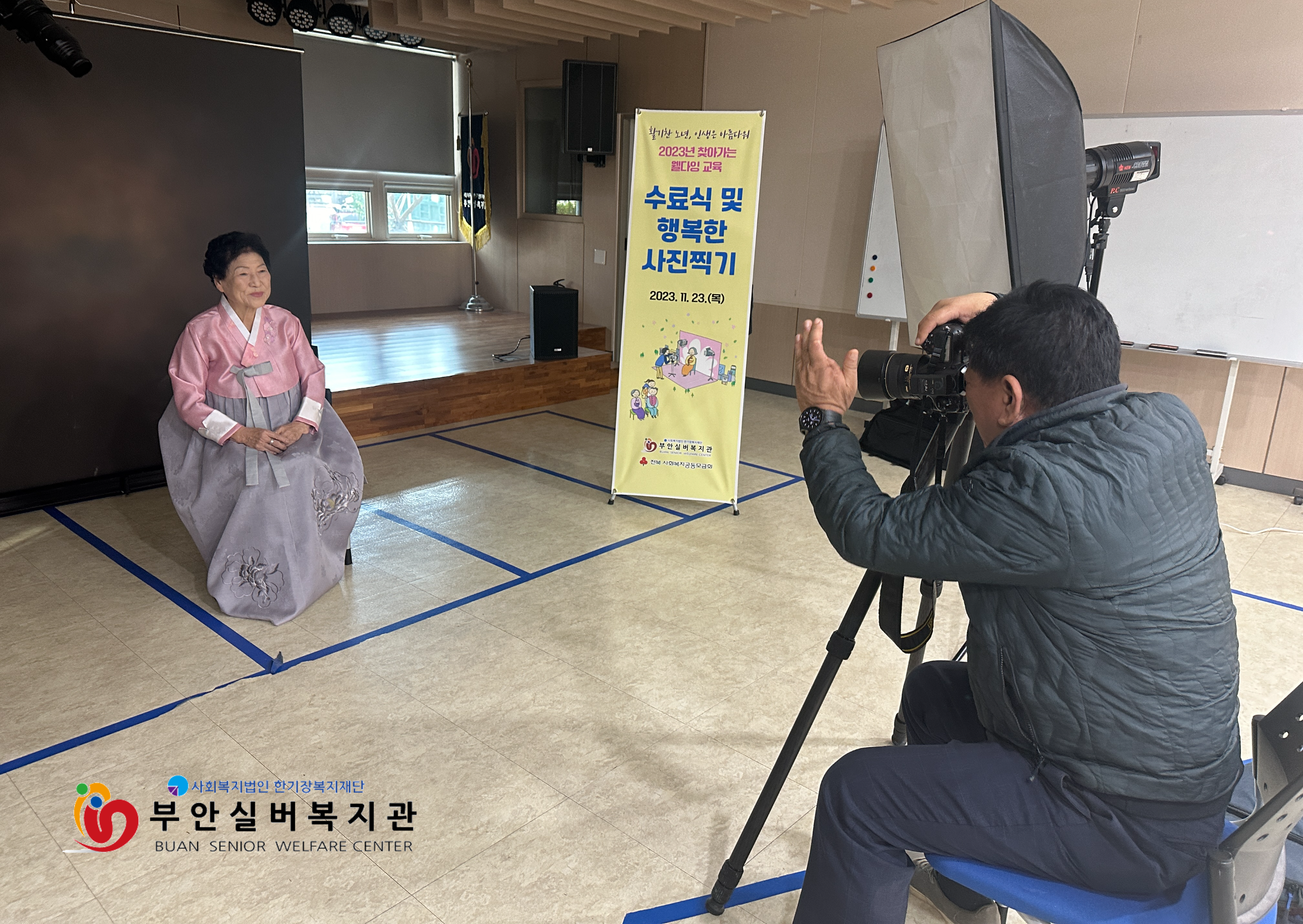 봉덕 주공 1차 아파트에서 '활기찬 노년, 인생은 아름다워! 건강하고 즐겁게 오늘을 살아가자'라는 주제로 이춘섭 강사와 함께 교육이 진행되었으며, 수료하신 어르신 16분을 대상으로 '장수사진(행복한 사진)'을 촬영했습니다. 이번 촬영은 한국사진작가협회 부안지부(지회장 최규석)와 부안군 사진동아리 '렌즈에 담은 풍경'(회장 김종성), 정화미용아카데미학원(원장 김정화)의 재능 나눔으로 이루어졌습니다.