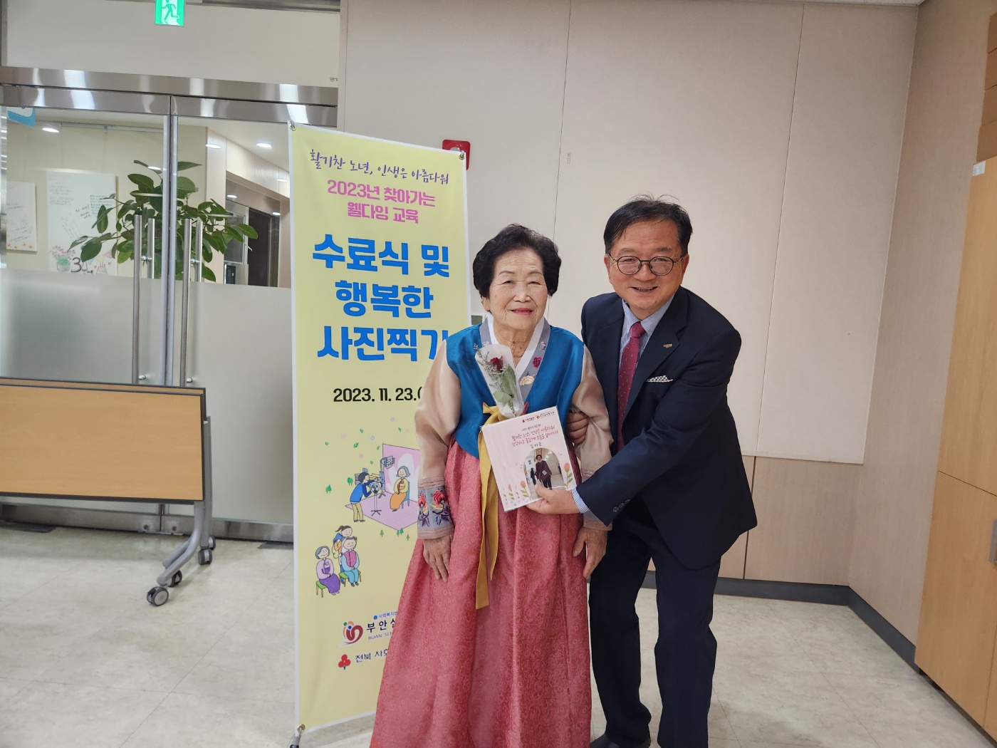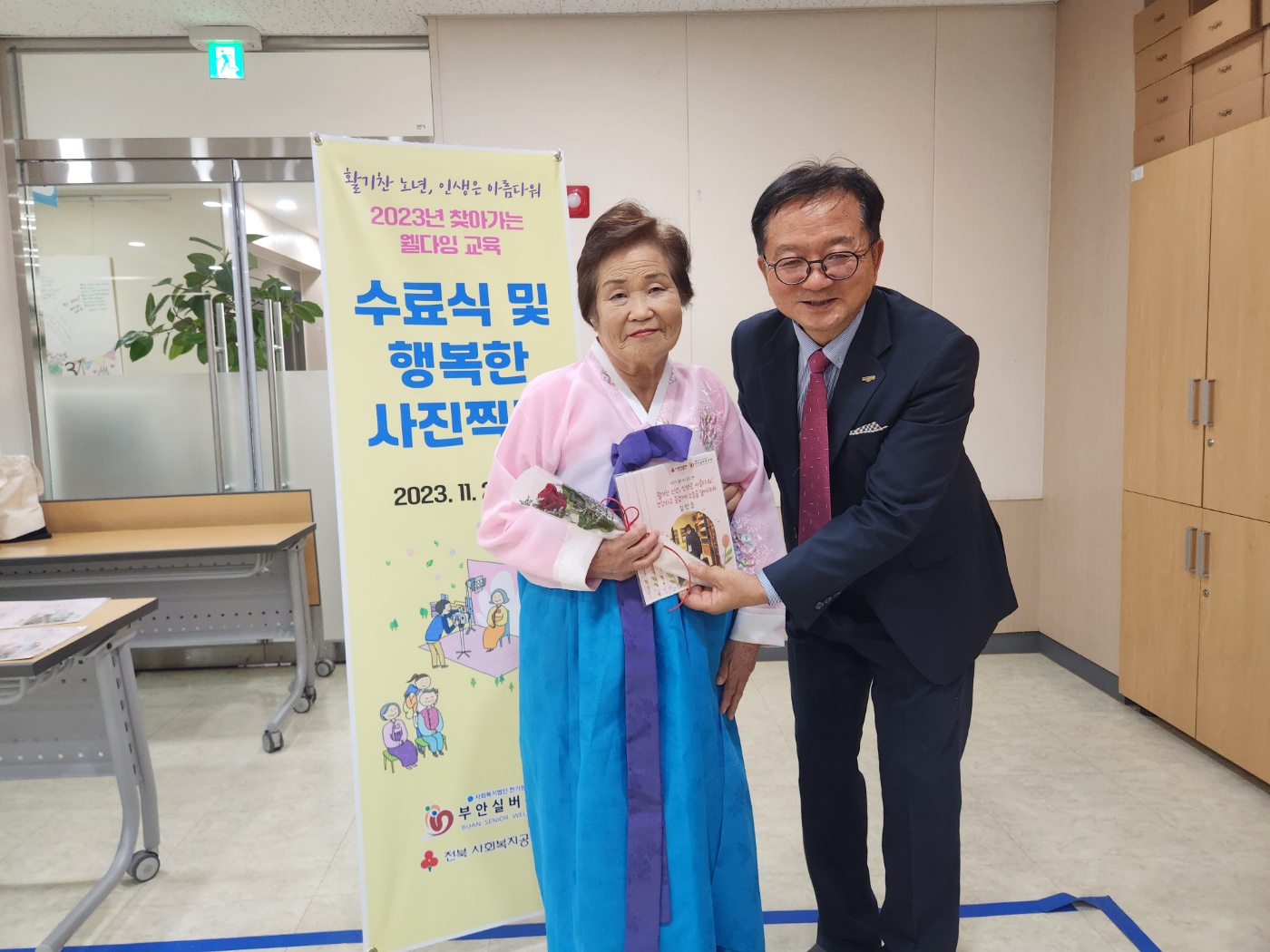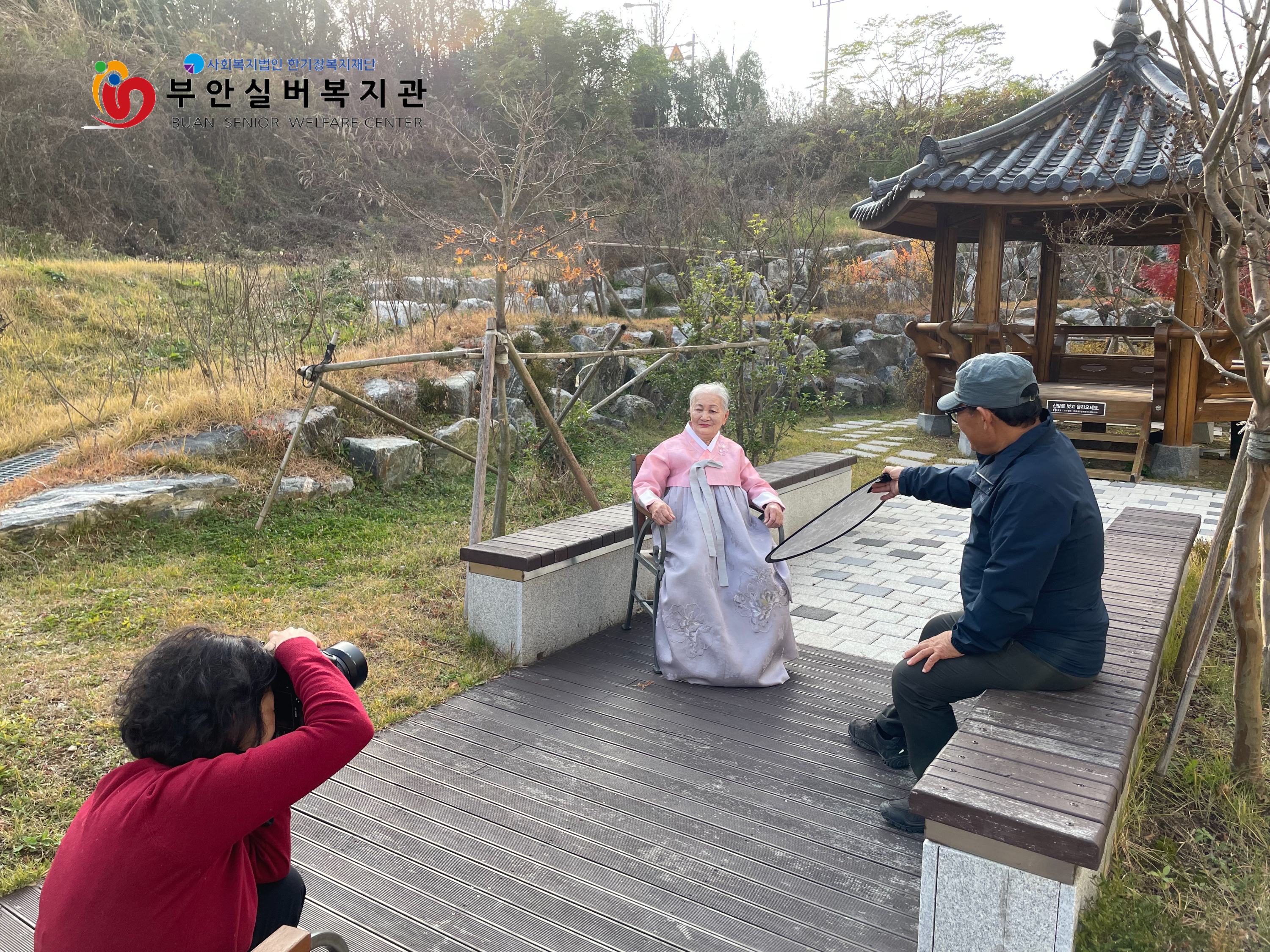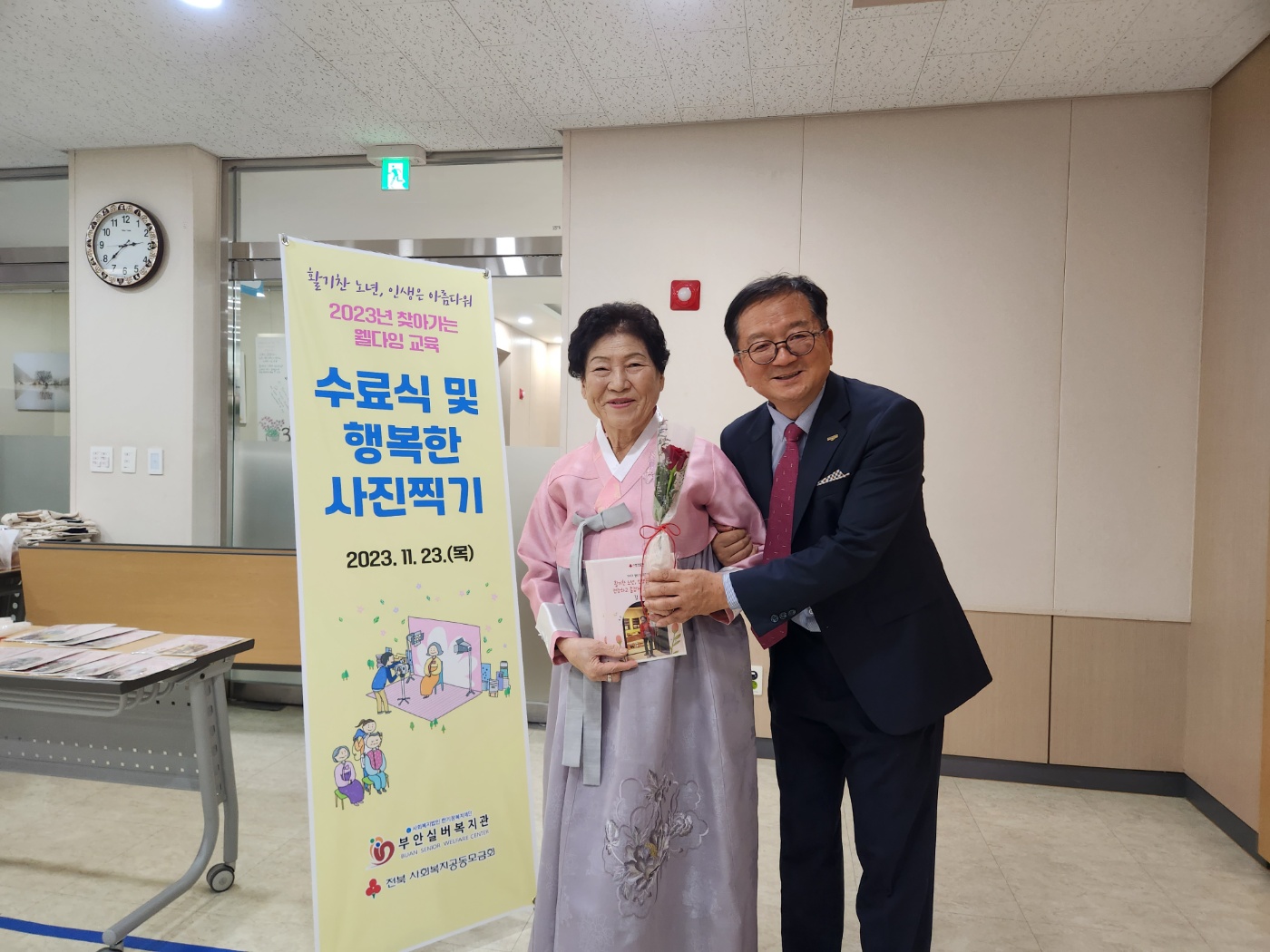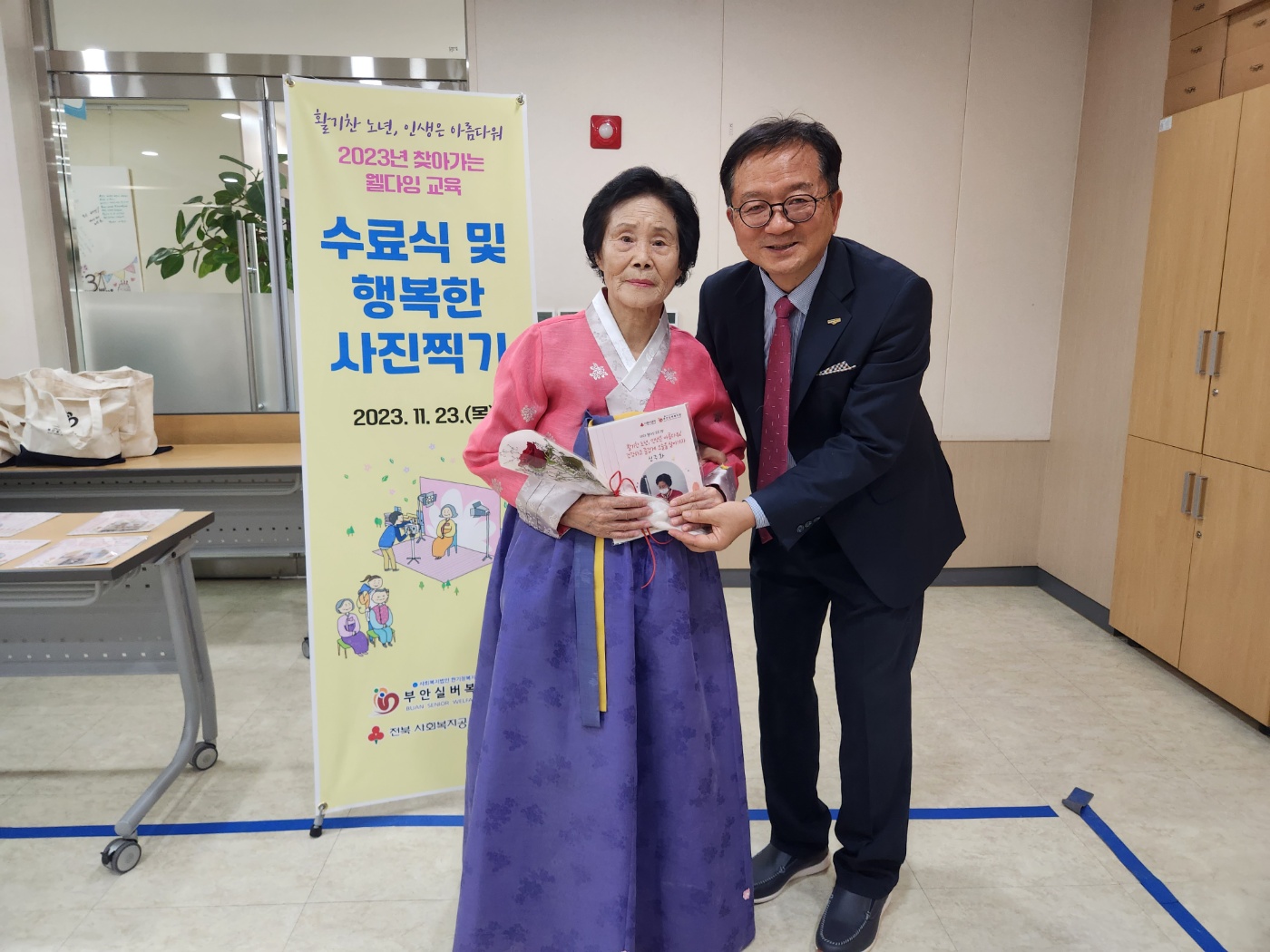 봉덕 주공 1차 아파트에서 '활기찬 노년, 인생은 아름다워! 건강하고 즐겁게 오늘을 살아가자'라는 주제로 이춘섭 강사와 함께 교육이 진행되었으며, 수료하신 어르신 16분을 대상으로 '장수사진(행복한 사진)'을 촬영했습니다. 이번 촬영은 한국사진작가협회 부안지부(지회장 최규석)와 부안군 사진동아리 '렌즈에 담은 풍경'(회장 김종성), 정화미용아카데미학원(원장 김정화)의 재능 나눔으로 이루어졌습니다.