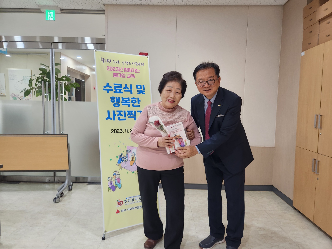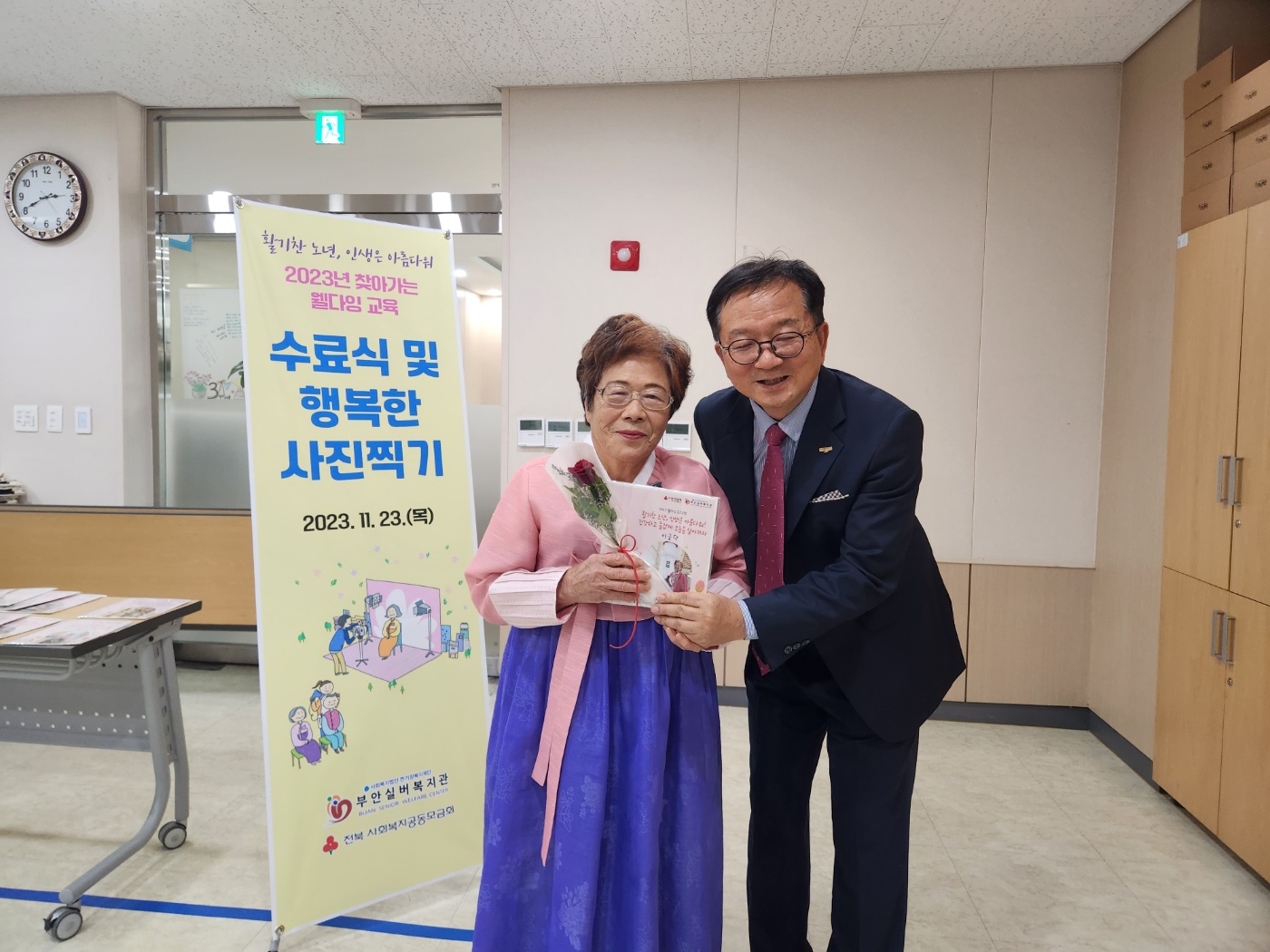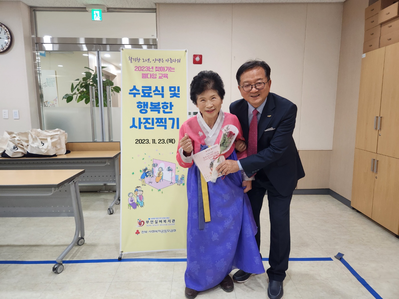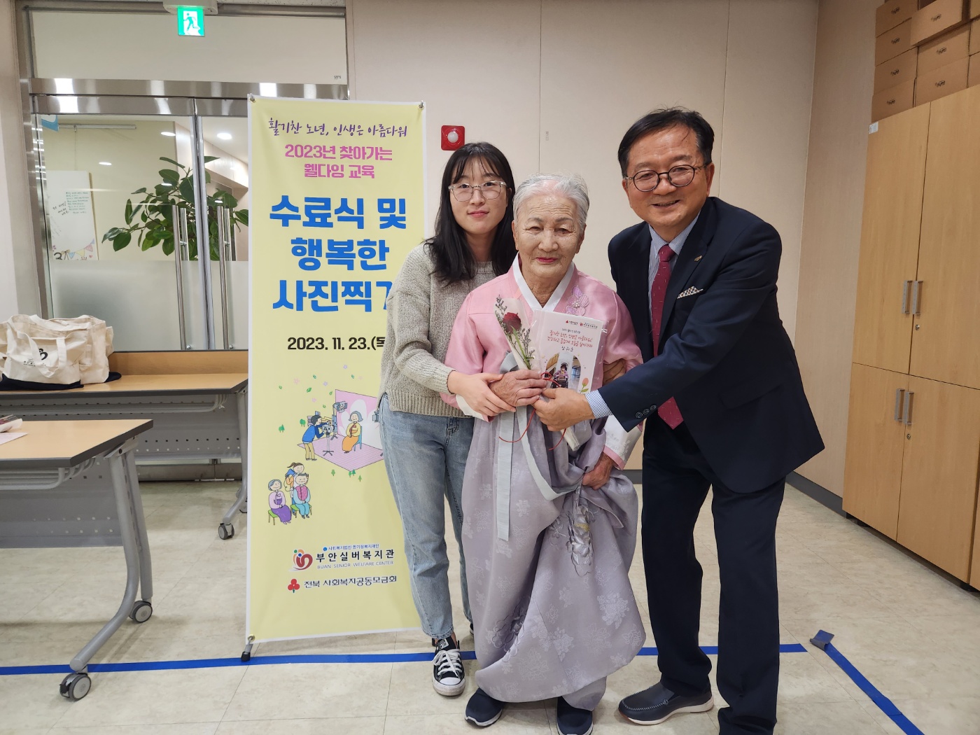 봉덕 주공 1차 아파트에서 '활기찬 노년, 인생은 아름다워! 건강하고 즐겁게 오늘을 살아가자'라는 주제로 이춘섭 강사와 함께 교육이 진행되었으며, 수료하신 어르신 16분을 대상으로 '장수사진(행복한 사진)'을 촬영했습니다. 이번 촬영은 한국사진작가협회 부안지부(지회장 최규석)와 부안군 사진동아리 '렌즈에 담은 풍경'(회장 김종성), 정화미용아카데미학원(원장 김정화)의 재능 나눔으로 이루어졌습니다.