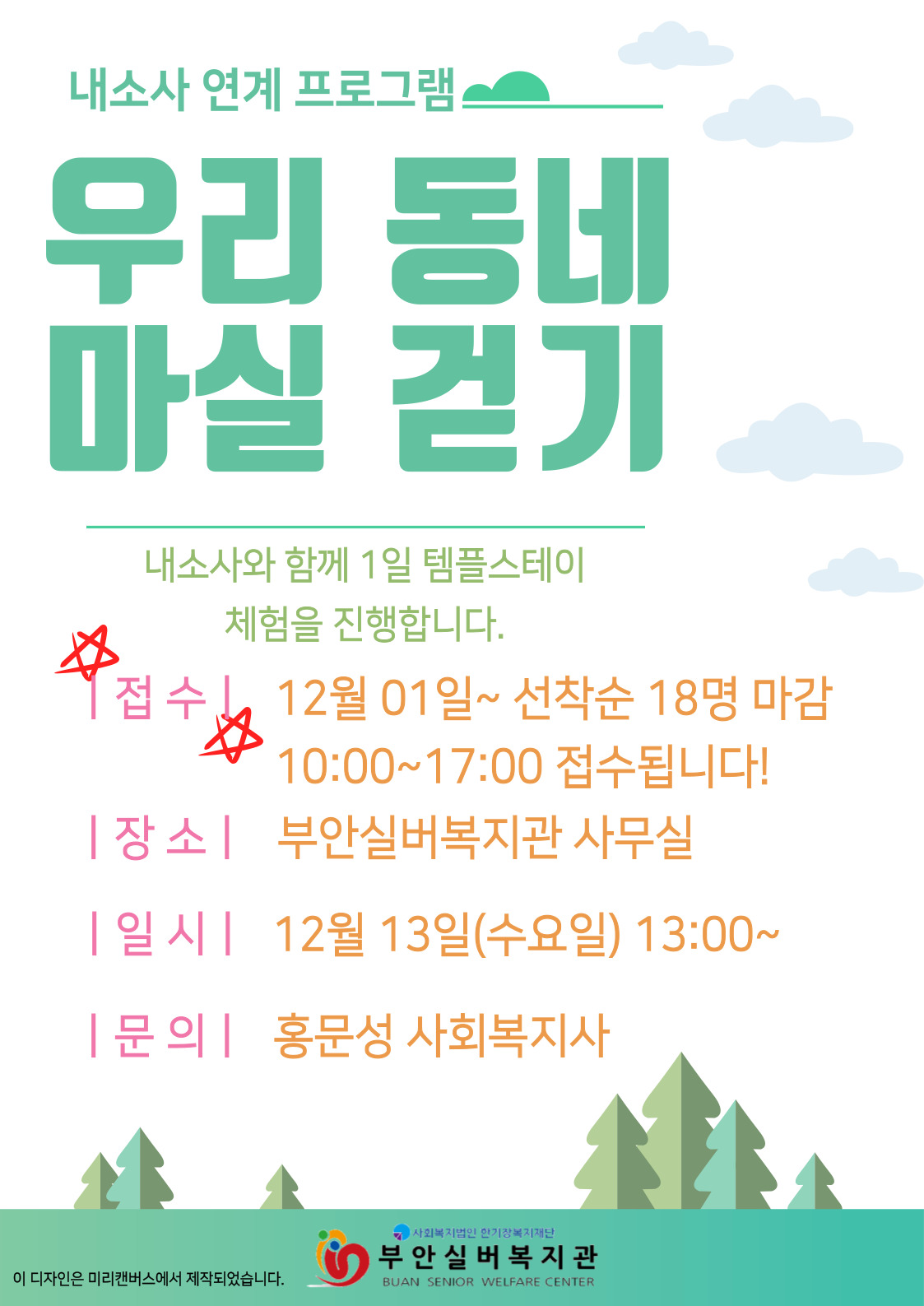 부안실버복지관에서는 내소사와 연계하여 1일 템플스테이 체험 프로그램인 "우리 동네 마실 걷기'를 진행하고자 합니다.