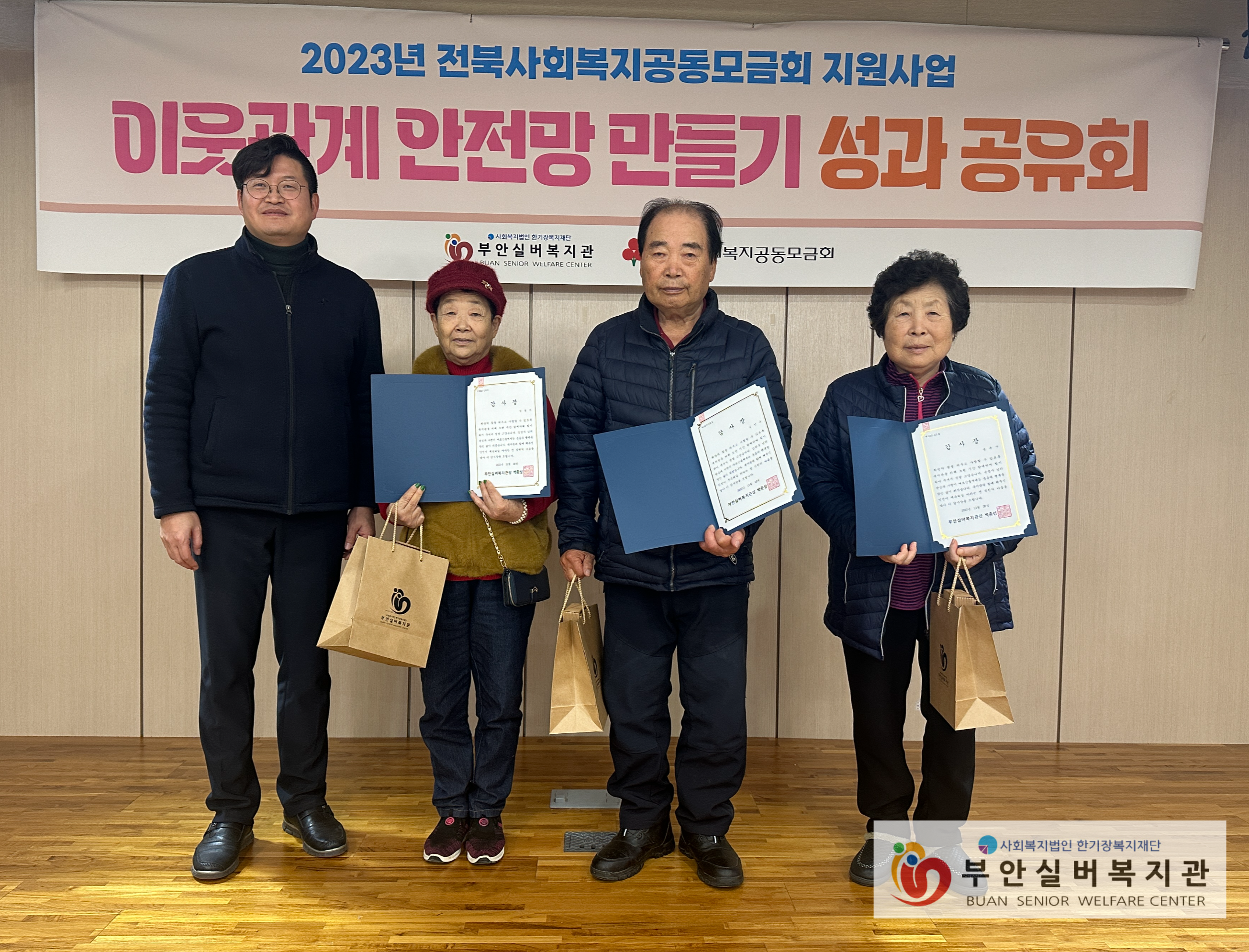 이날 행사에는 이웃관계안전망사업의 자원봉사와 후원으로 협력해준 부안군사진작가협회, 정화미용아카데미, 행복한부엌과 4명의 어르신들에게 감사장을 전달하였습니다.