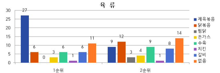 육류를 이용한 메뉴 중 가장 맛있게 먹었던 1순위 음식으로는 제육볶음, 닭볶음, 갈비, 수육 순으로 응답하였다. 응답 결과 어르신들은 튀긴 고기보다는 볶거나 삶은 조리법을 이용한 고기 음식을 선호하였고 ,보기에 없다’를 선택한 어르신은 대부분 건강 문제로 육류를 즐겨 드시지 않았다.