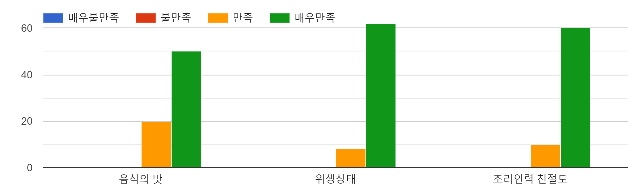The행복한밥상 급식소 이용 중 전반적인 만족도는매우만족이 음식의 맛에 대한 전반적인 만족 정도는 응답인원 70명 중 50명이 매우 만족, 20명이 만족한다이라고 응답하였다. 급식소의 위생상태 만족도는 70명 중 62명이 매우 만족, 8이 만족이라고 응답했으며, 조리원 및 배식인력의 친절도로는 70명중  매우만족 이라고 응답한 인원이 60명이 만족한다라고 응답하여 대체적으로 급식소에 대한 만족도가 높은 것으로 나타났다.