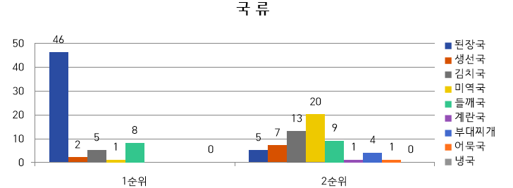 The행복한밥상을 이용하는 어르신들 중 저작 및 소화기능이 좋지 않아 국에 밥을 말아 드시는 분들이 많은데 국에 대한 기호도 조사 결과 1순위로는 속을 편하게 해주는 된장국에 대한 기호도가 제일 높고, 2순위로는 골고루 응답했다.