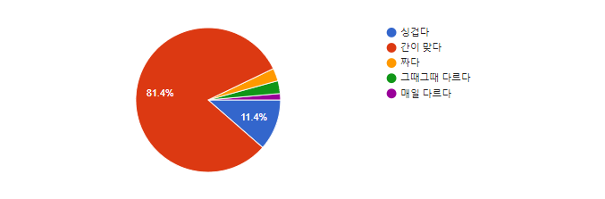 ’ 음식의 간이 어떠한가!‘에 대한 질문에는 응답인원 70명 중 57(81.4%)간이 맞다라고 응답하였으며 짜다라는 응답이 2명(3%),2명(3%), 그때그때 다르다는 응답이 1(1.4%) 있었다The행복한밥상에서는 국은 0.6, 찌개류는 0.8의 염도로 조리하여 관리하고 있으며 국이 싱겁다고 말씀하시는 경우에는 소금을 따로 제공하고 있다.