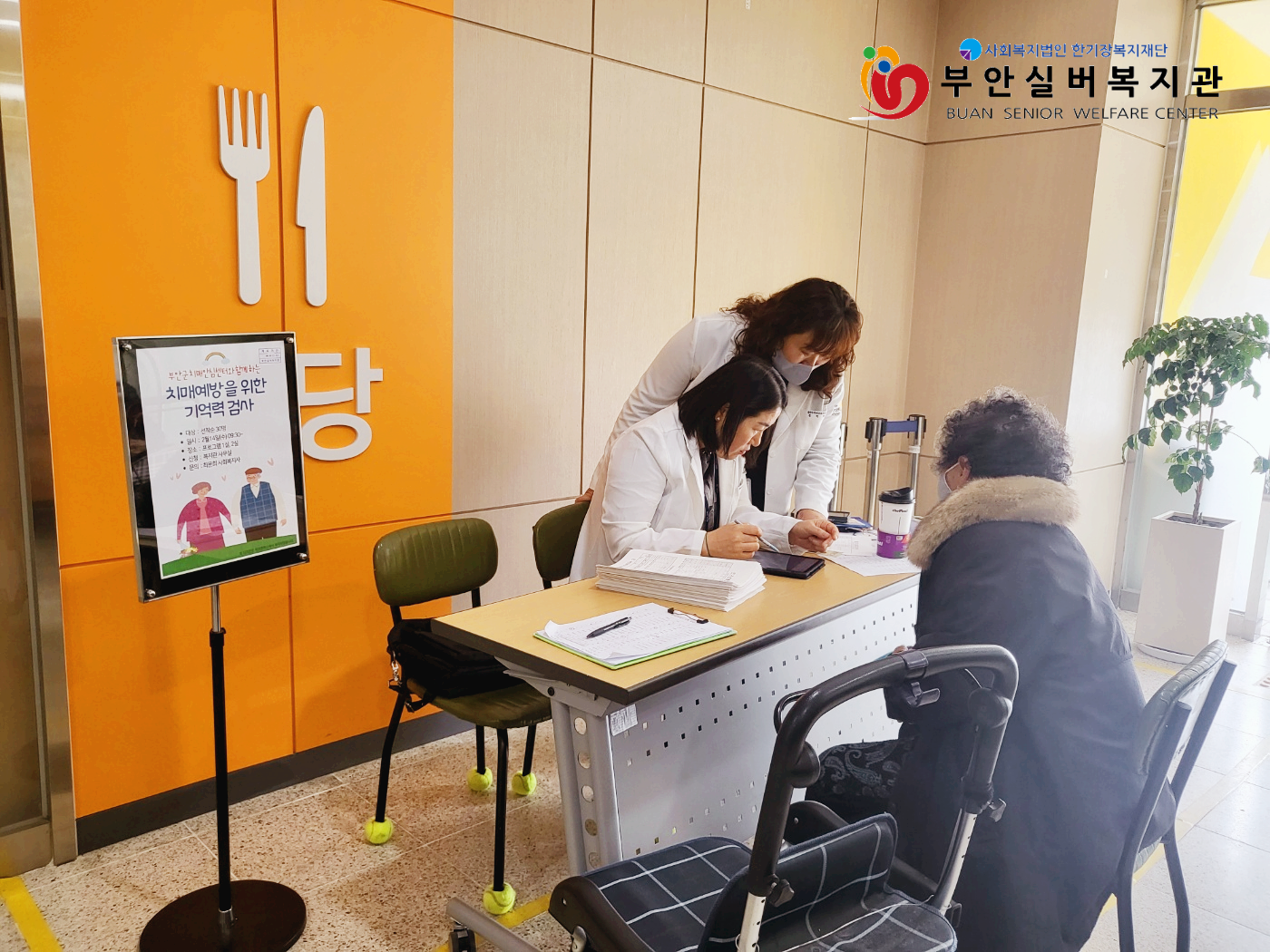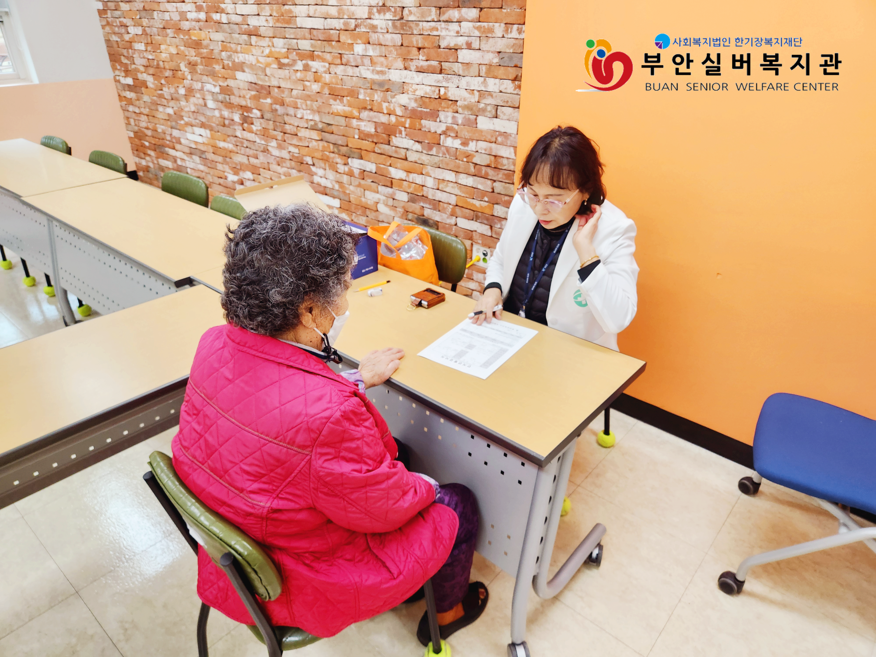 어르신들의 치매예방을 위한 '인지선별검사 및 상담'이 2월 14일에 진행되었습니다. '찾아오는 방문 보건 서비스' 일환으로 진행된 인지선별검사는 부안군치매안심센터에서 복지관에 방문하여 진행하였으며, 40여 명의 어르신이 검사와 상담을 받았습니다.