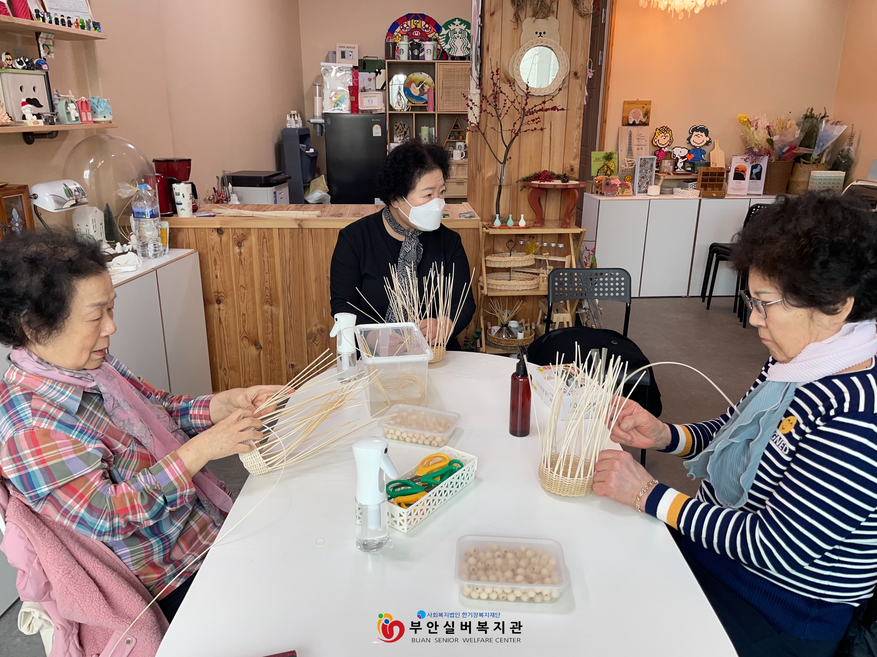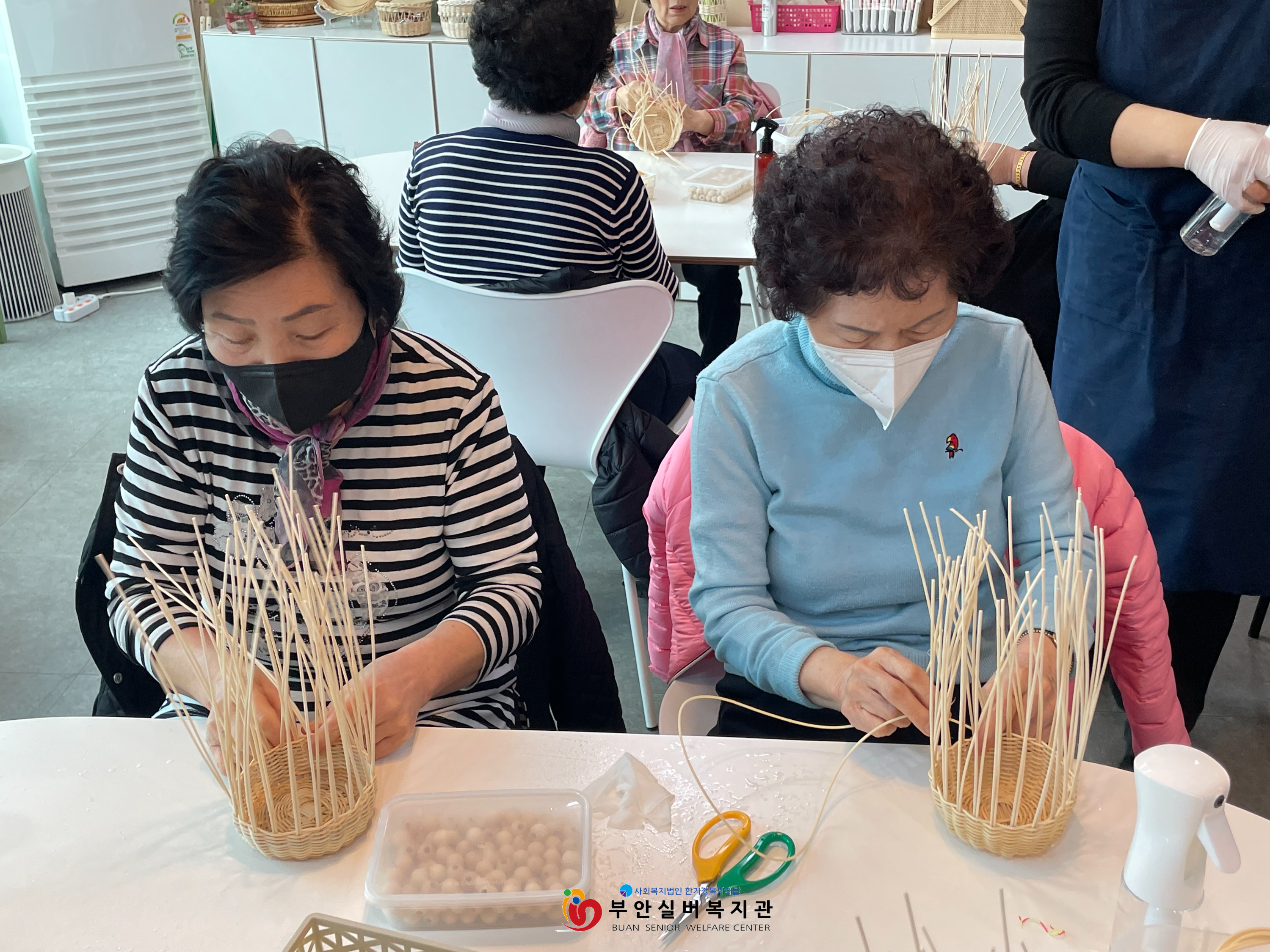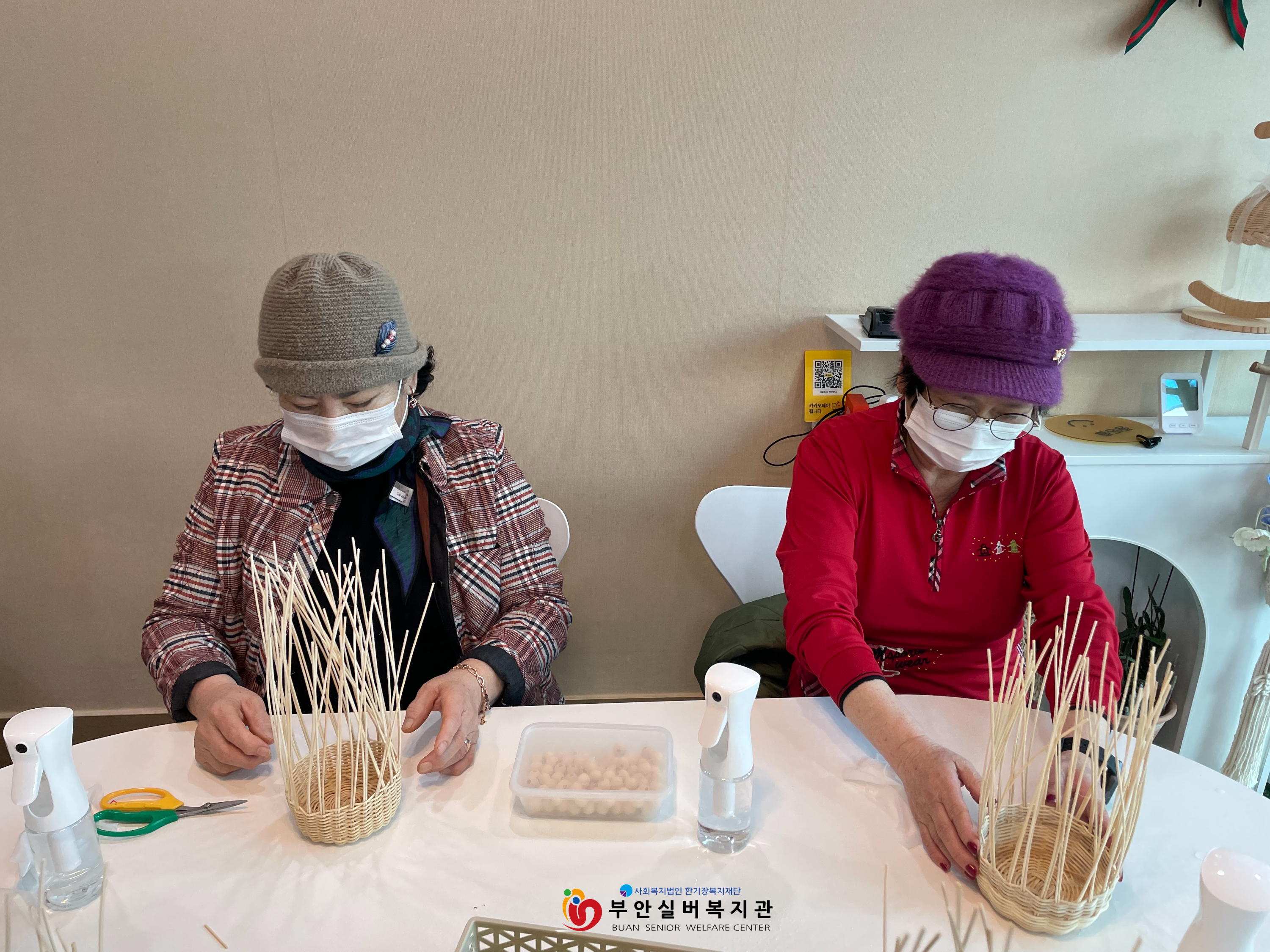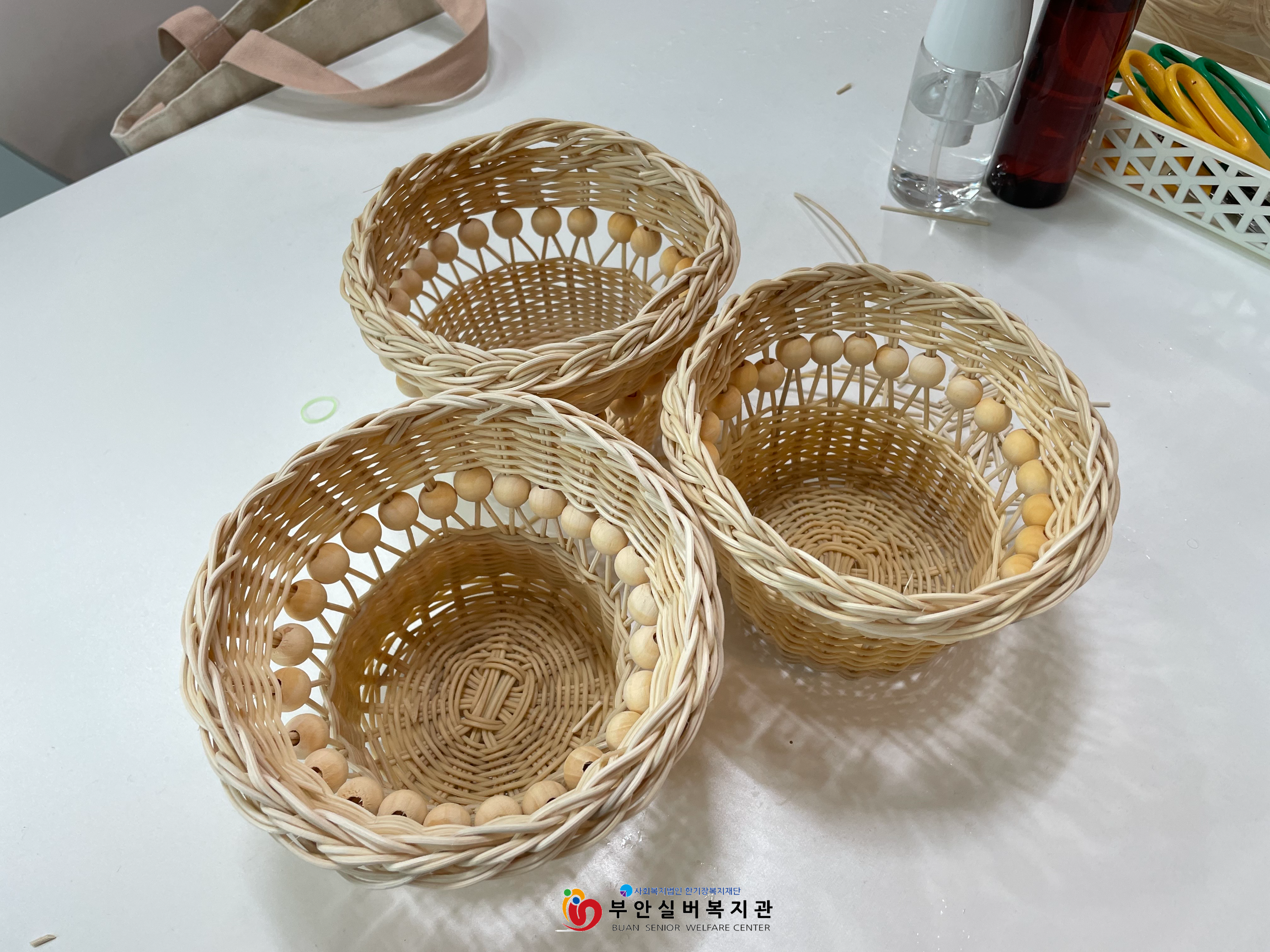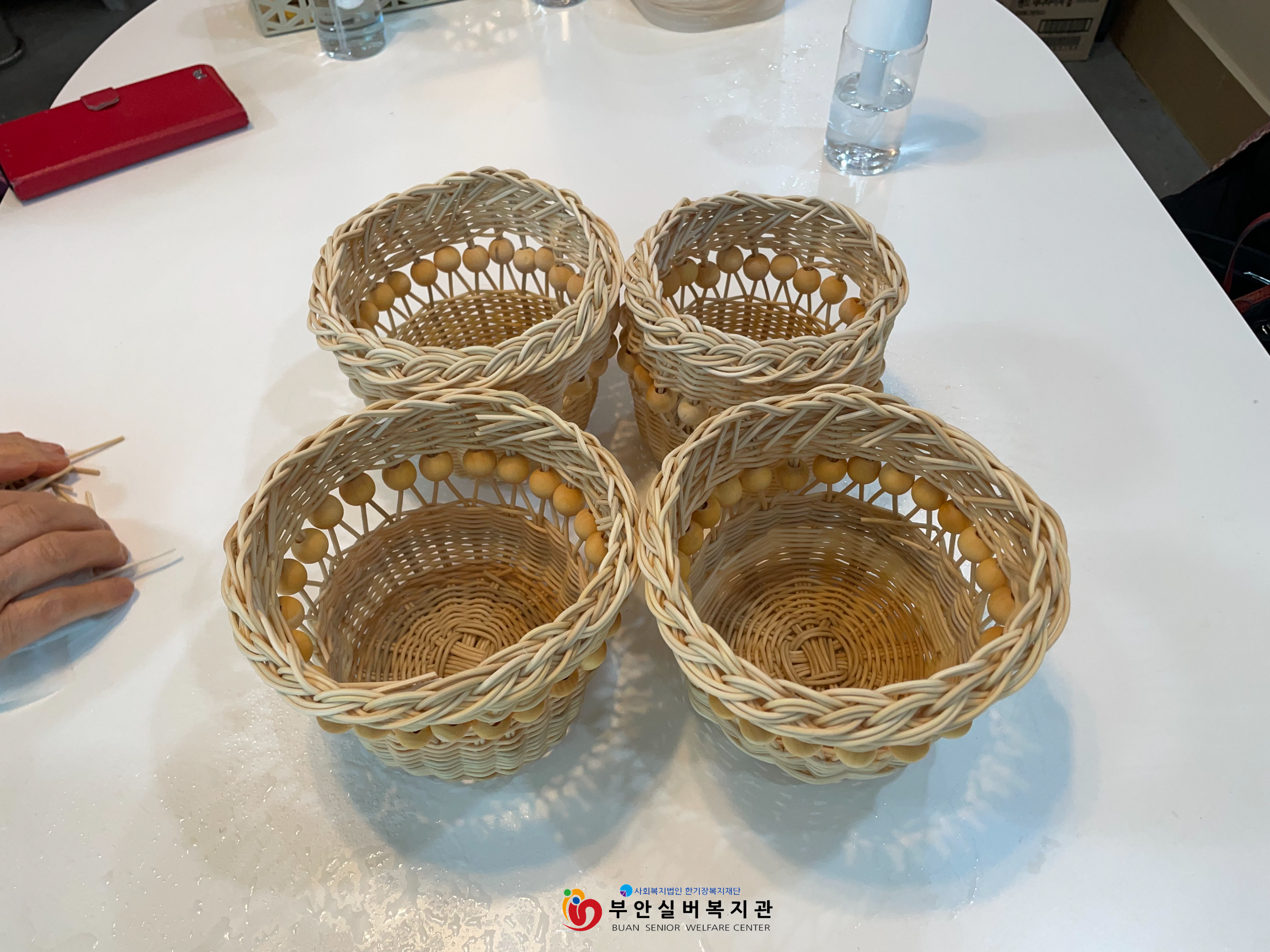 어르신들은 실처럼 가공된 등나무를 엮으면서 "옛날에 가마니를 짜던 추억이 떠오른다."고 하셨습니다. 집중하며 엮다 보니 시간가는 줄 몰랐다고 하시며, 완성된 바구니 사진을 찍어 손자에게 자랑해야겠다고 함박웃음을 지으셨습니다.
