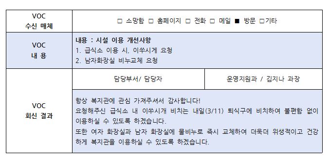 | 고객의 소리- 실버복지관 도로변 입구 안내판 확대 / 이용자 화장실 불편사항 (0) | 2021.11.30 |