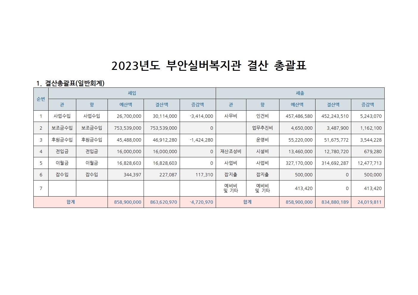 사회복지법인 및 사회복지시설 재무 회계 규칙 제10조(예산의 편성 및 결정절차) 4항에 의거하여 부안실버복지관의 2023년 결산을 공고합니다.