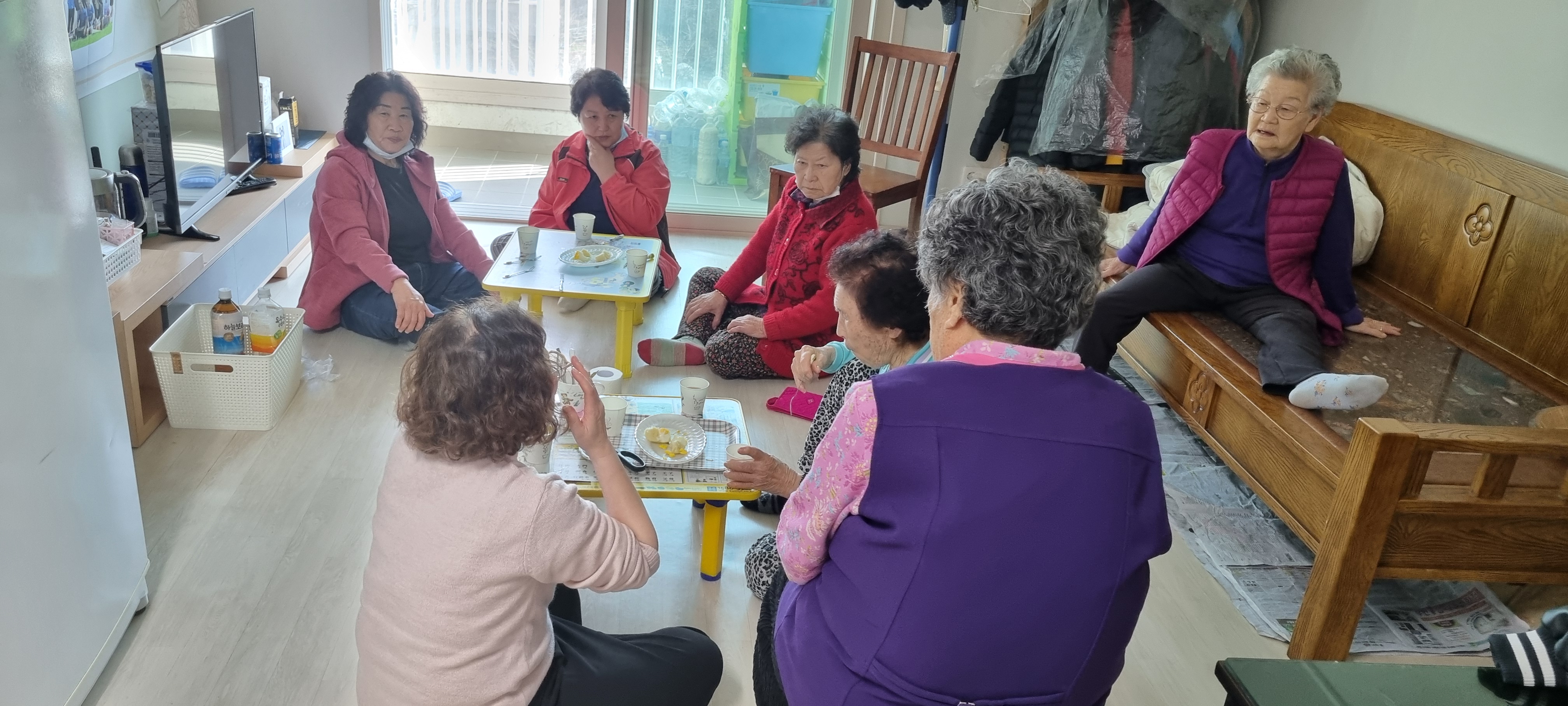 지난달 어르신들과 층별 공동체 활동에 대해 이야기했습니다. 2~4층은 최○○님 댁, 5~6층은 윤○○님 댁, 7층은 경○○님 댁, 8~10층은 이○○님 댁, 마지막으로 남성 어르신들은 최○○님 댁에서 만났었습니다. 지난 3년 동안 복지관에서만 만났지 이렇게 집에 초대한 적도 초대받아 집에 갔던 적이 없었던 것 같습니다.
