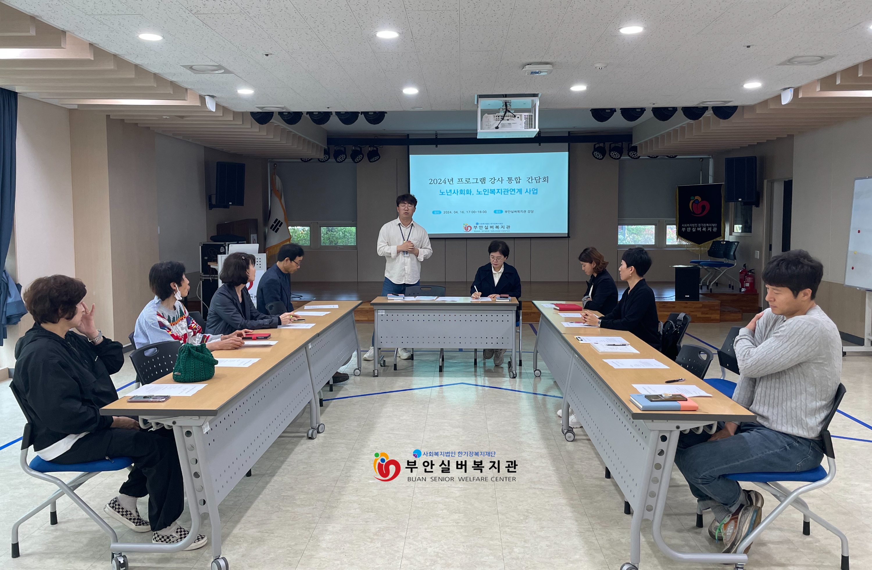 부안실버복지관 어르신 프로그램 통합 간담회가 4월 16일 진행되었습니다. 이번 간담회는 어르신 평생학습을 지도해 주시는 강사님과 노인복지관 연계사업으로 경로당을 찾아가 프로그램을 진행하시는 강사님들이 참여하였습니다.