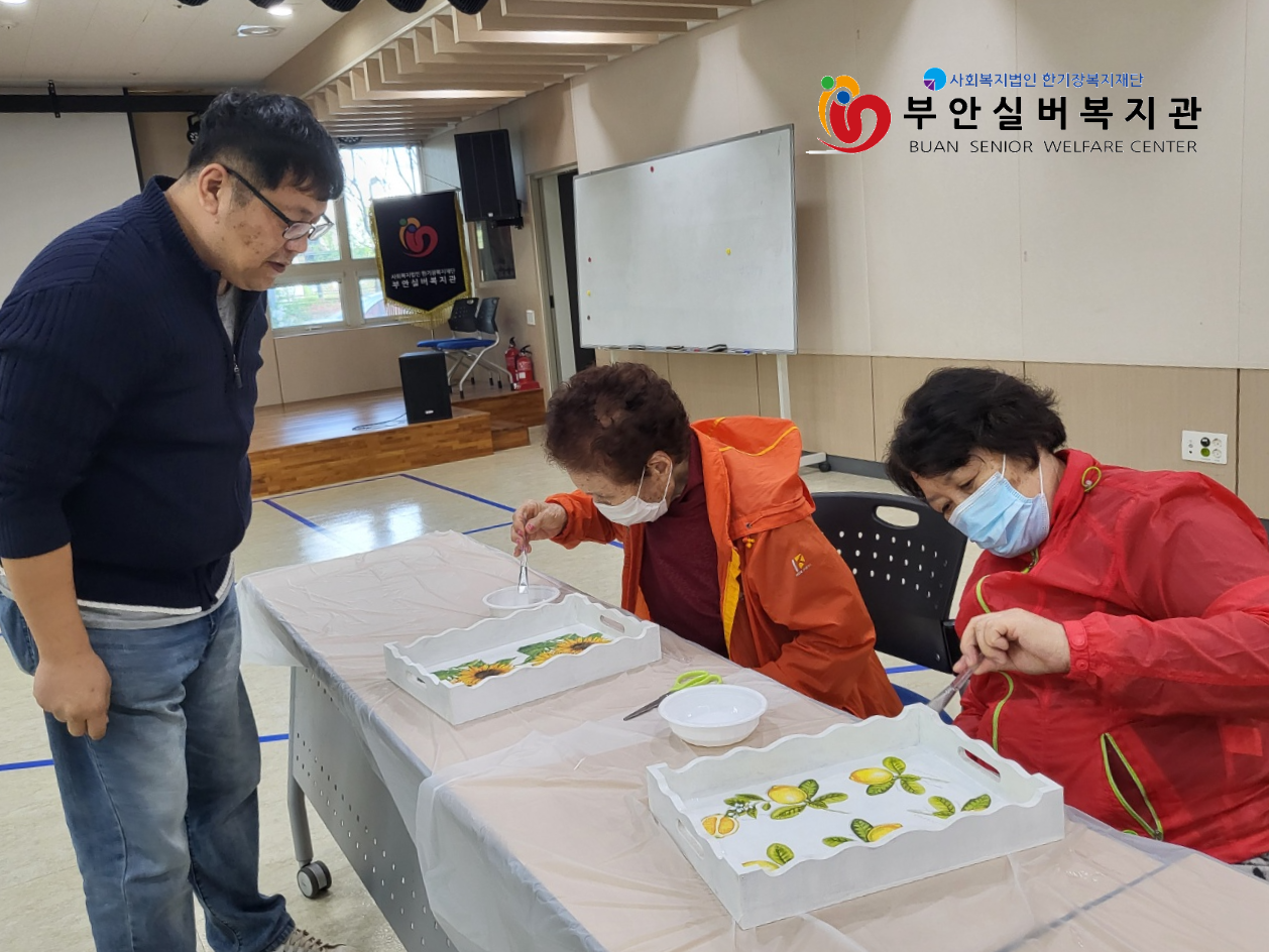 '나, 육순덕이여!'를 외치며 다른 사람의 도움없이 혼자서 냅킨아트 쟁반을 끝까지 완성하려고 노력하십니다. 사회복지현장실습 실습생이 옆에서 도움을 주려 하였으나 스스로 붙이고 칠하겠다 하십니다. 냅킨이 쟁반에 잘 붙지 않아 어려움이 있었지만 누구 하나 불만 없이 문제가 해결될 때까지 기다려 주고, 잘한다 예쁘다 서로를 격려하고 칭찬하는 어르신들의 모습이 단합이 잘 되는 이유인 듯합니다.