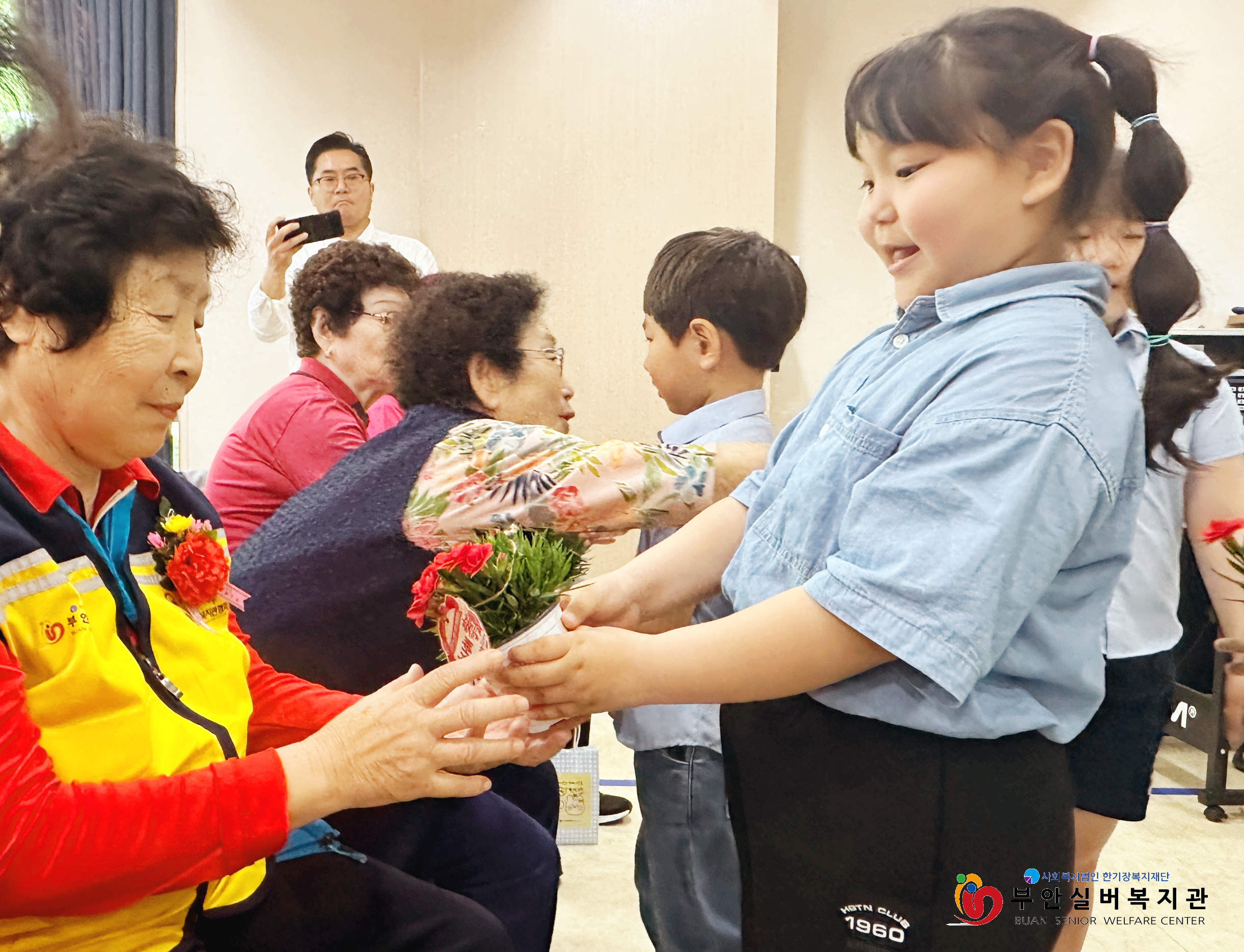 부안실버복지관 어버이날을 맞아 복지관 이용 어르신들에게 감사의 마음을 전하는 ‘감사해孝’ 행사를 진행했습니다. 기념행사에는 알파벳어린이집 어린이들이 함께해 훈훈한 시간이 되었는데요, 어린이들은 축하공연으로 국악 동요를 불러 어르신들의 큰 박수를 받았습니다.  공연을 마치고 난 후에는 어르신들에게 일일이 카네이션 꽃을 드리며 감사하는 마음을 전했습니다. 꽃을 전해 받은 어르신들은 아이들과 눈을 맞추며 '예쁘다, 귀엽다, 고맙다'는 말을 아끼지 않으셨습니다.