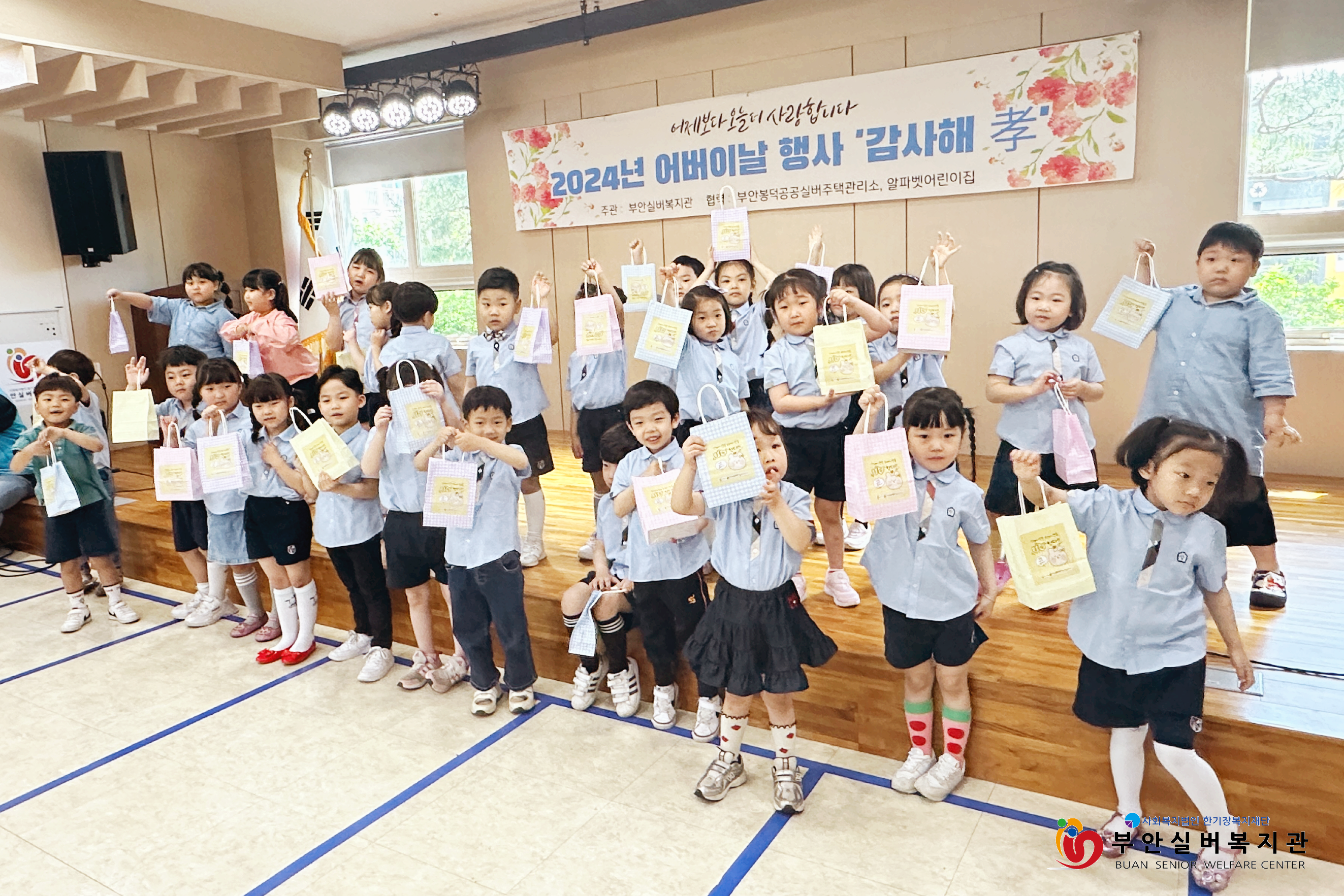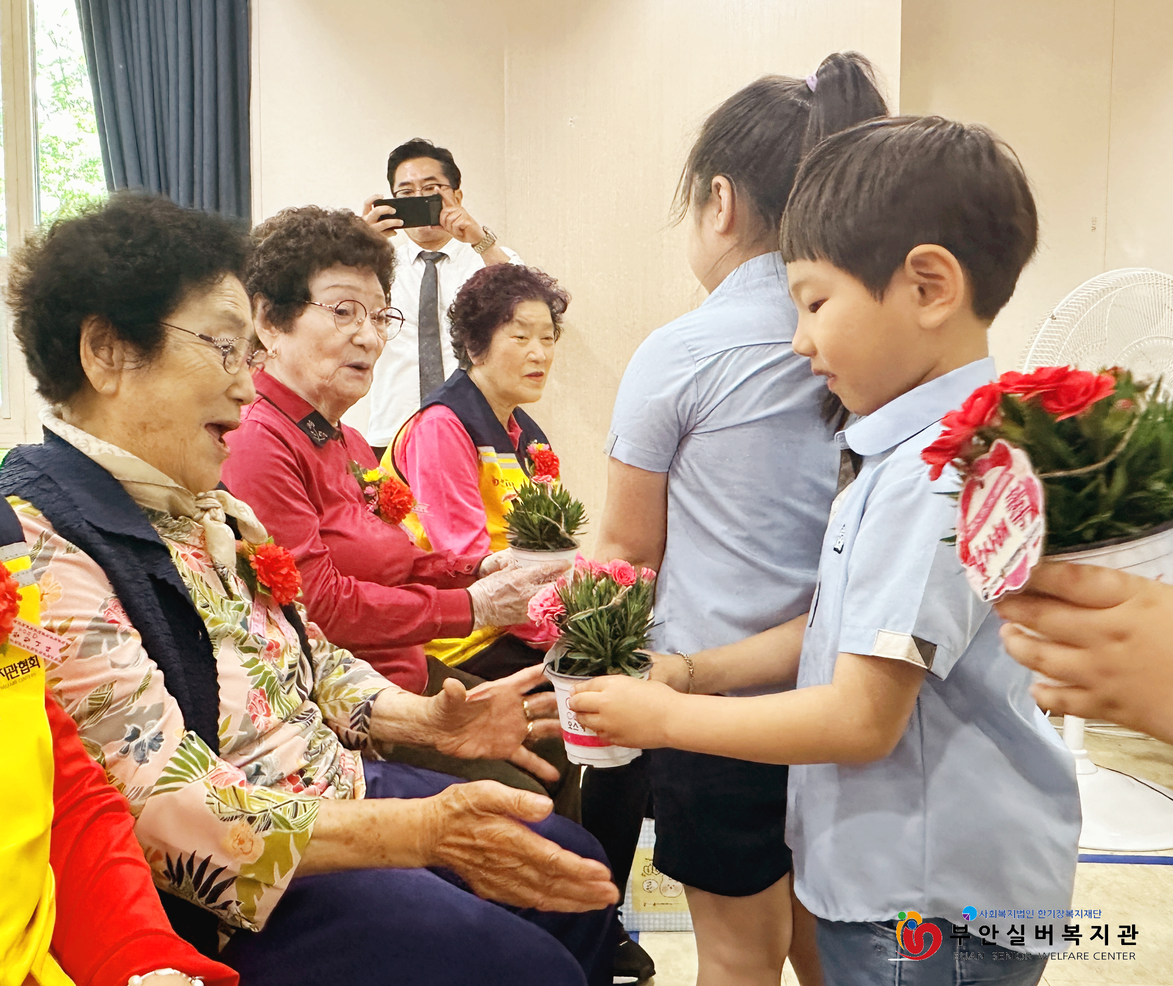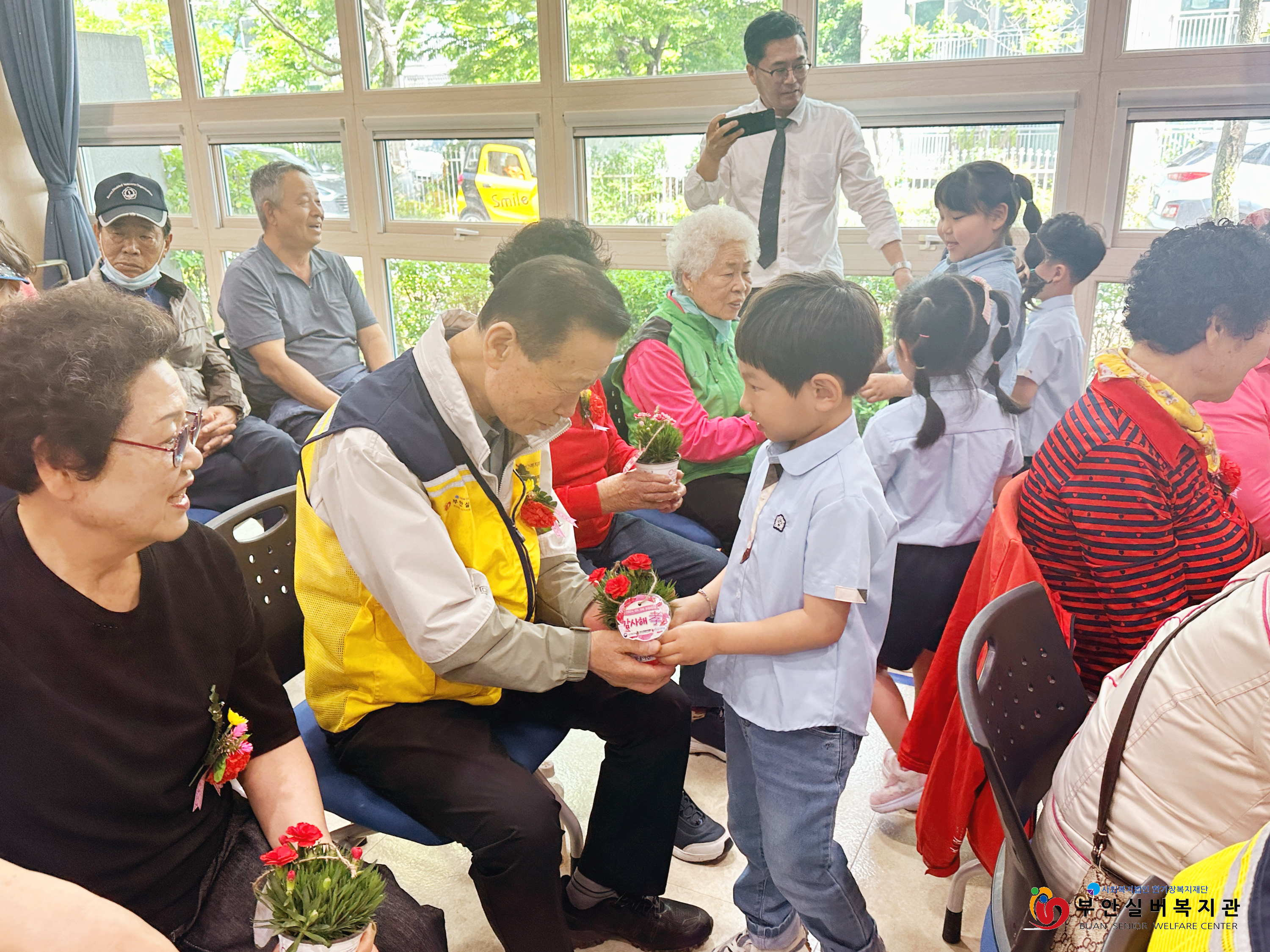 부안실버복지관은 어버이날을 맞아 복지관 이용 어르신들에게 감사의 마음을 전하는 ‘감사해孝’ 행사를 진행했습니다. 기념행사에는 알파벳어린이집 어린이들이 함께해 훈훈한 시간이 되었는데요, 어린이들은 축하공연으로 국악 동요를 불러 어르신들의 큰 박수를 받았습니다. 공연을 마치고 난 후에는 어르신들에게 일일이 카네이션 꽃을 드리며 감사하는 마음을 전했습니다. 꽃을 전해 받은 어르신들은 아이들과 눈을 맞추며 '예쁘다, 귀엽다, 고맙다'는 말을 아끼지 않으셨습니다.