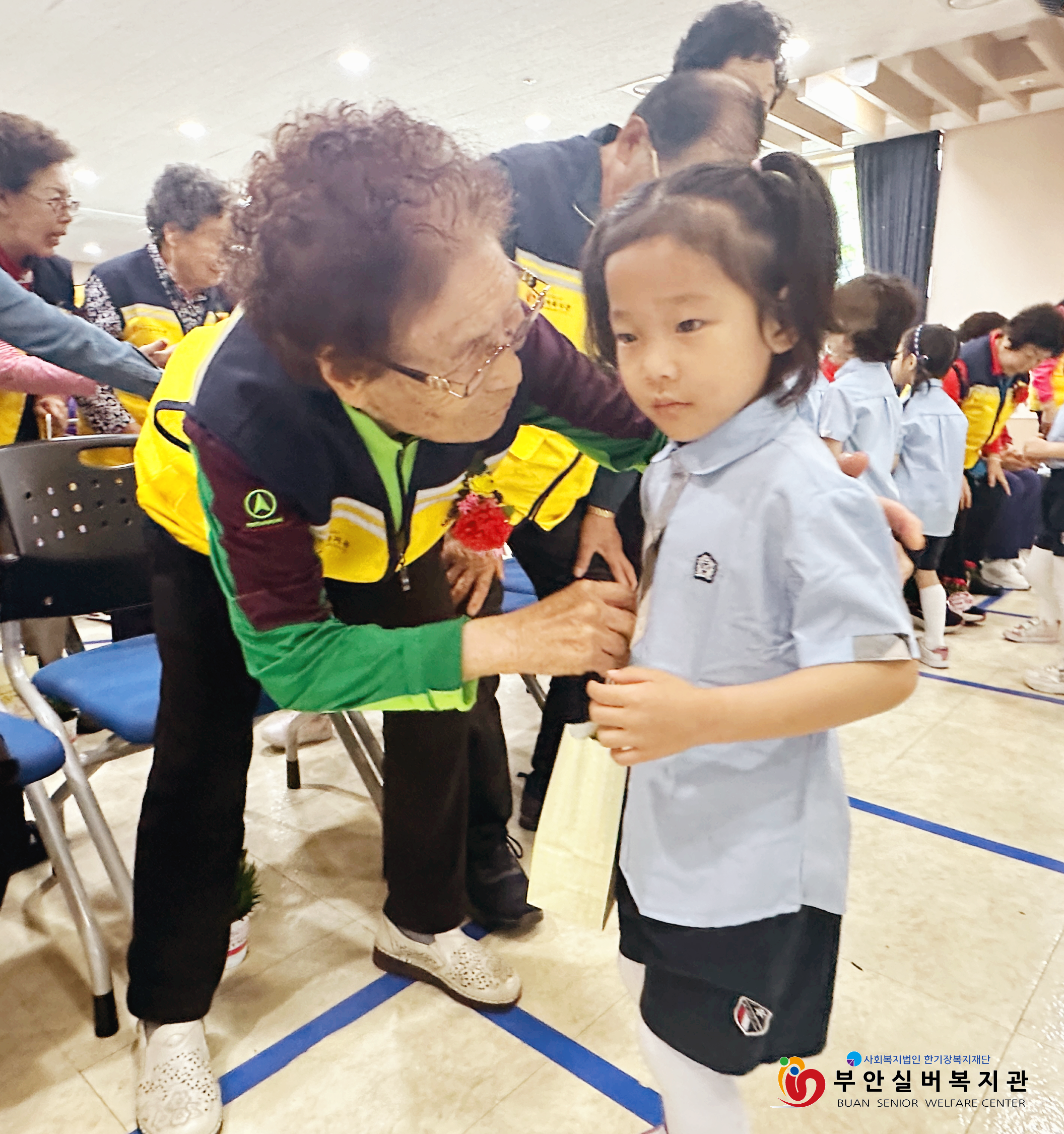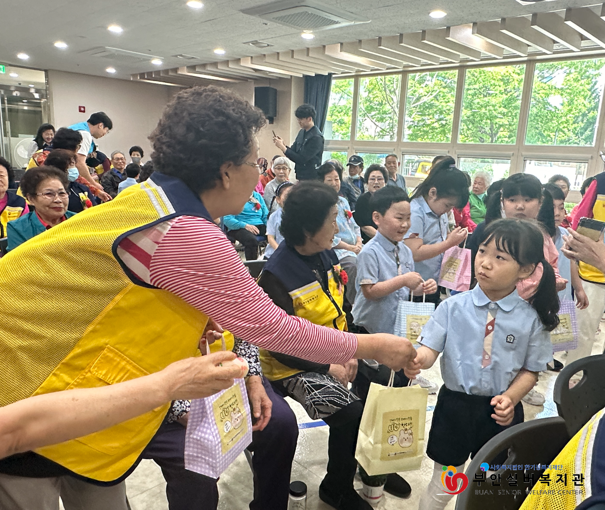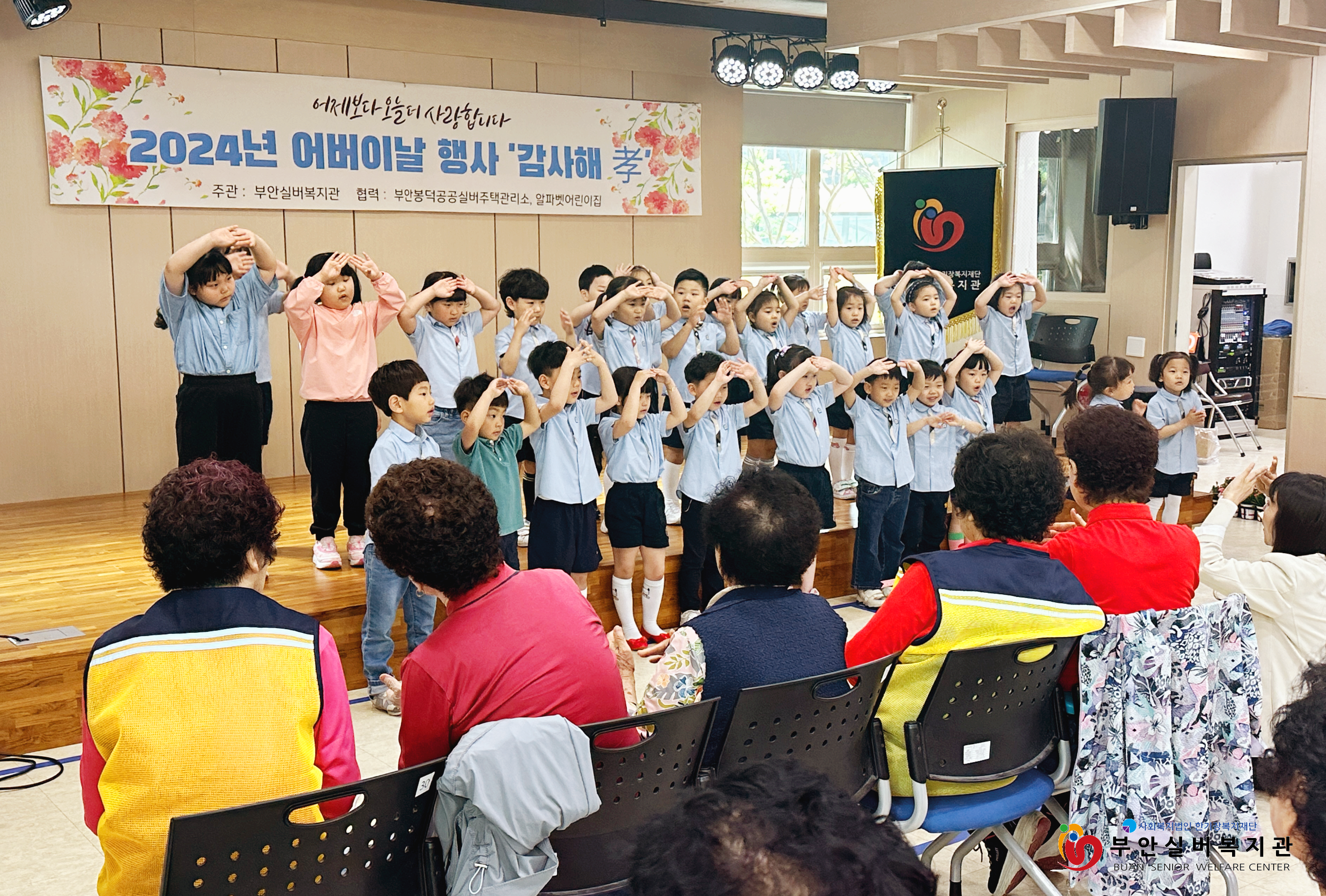 부안실버복지관은 어버이날을 맞아 복지관 이용 어르신들에게 감사의 마음을 전하는 ‘감사해孝’ 행사를 진행했습니다. 기념행사에는 알파벳어린이집 어린이들이 함께해 훈훈한 시간이 되었는데요, 어린이들은 축하공연으로 국악 동요를 불러 어르신들의 큰 박수를 받았습니다. 공연을 마치고 난 후에는 어르신들에게 일일이 카네이션 꽃을 드리며 감사하는 마음을 전했습니다. 꽃을 전해 받은 어르신들은 아이들과 눈을 맞추며 '예쁘다, 귀엽다, 고맙다'는 말을 아끼지 않으셨습니다.