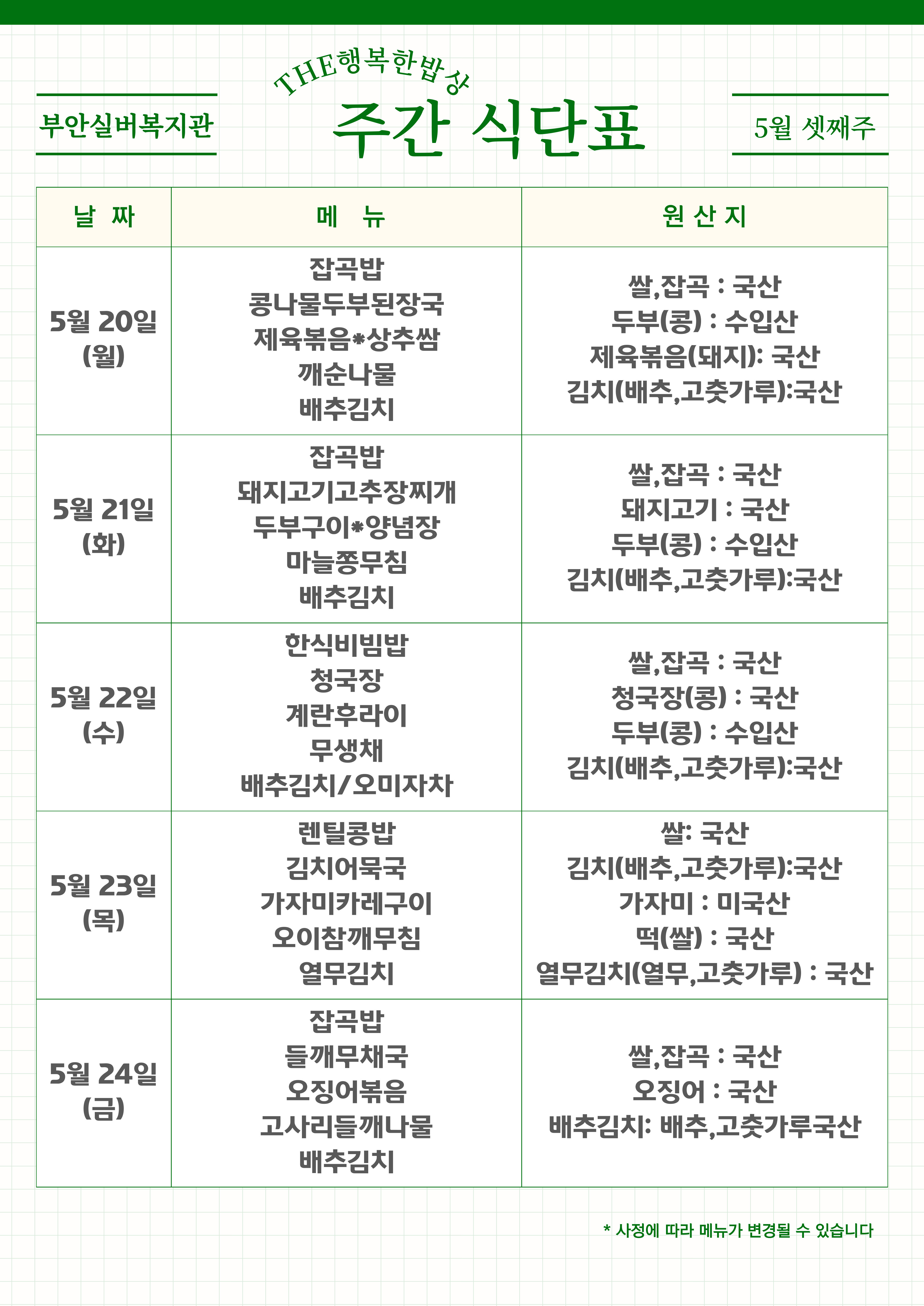 | 복지관 식단표 - 5월 1주 (0) | 2024.05.08 |