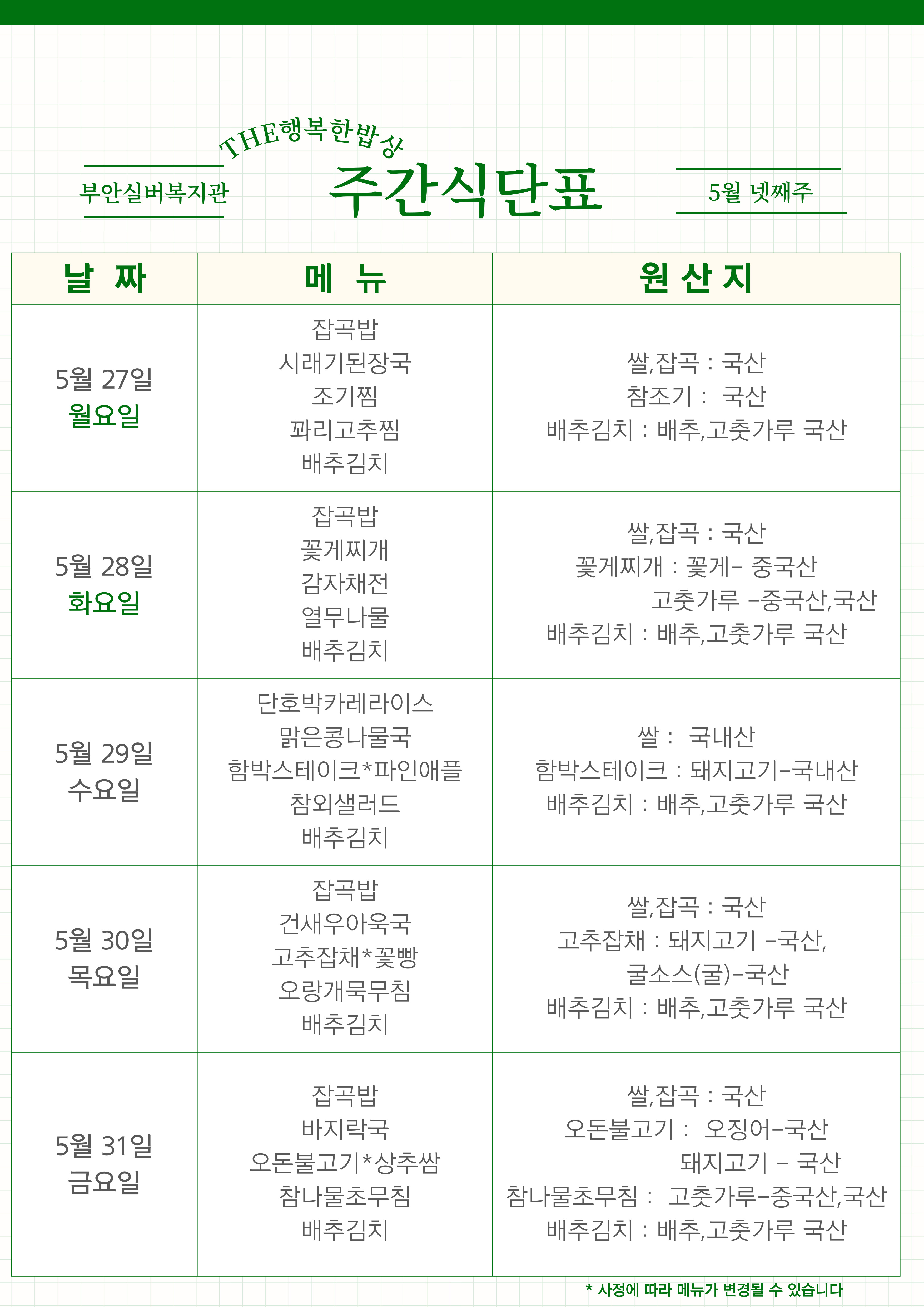 ※ 식단은 후원품 및 시장 구매 사정에 따라 변경될 수 있습니다.