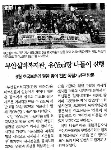 부안실버복지관(관장 박준성)은 어르신들이 일상에서 벗어나 새로운 장소에서 심신의 피로를 풀고 새로운 에너지를 얻을 수 있도록 지난 28일 80명의 어른들과 함께 \'유(You)랑 나들이\'를 다녀왔