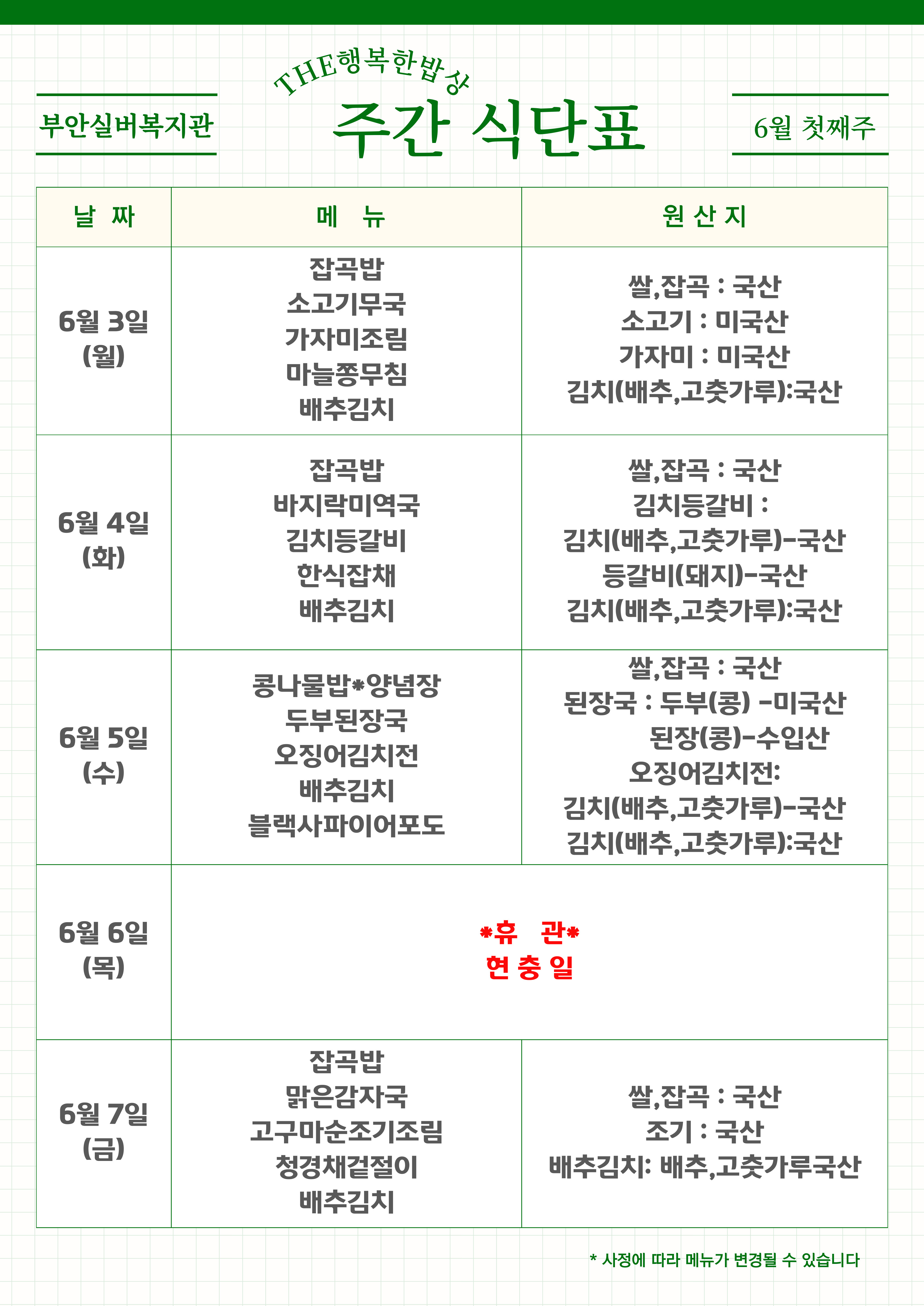 | 복지관 식단표 - 6월 2주 (0) | 2024.06.07 |