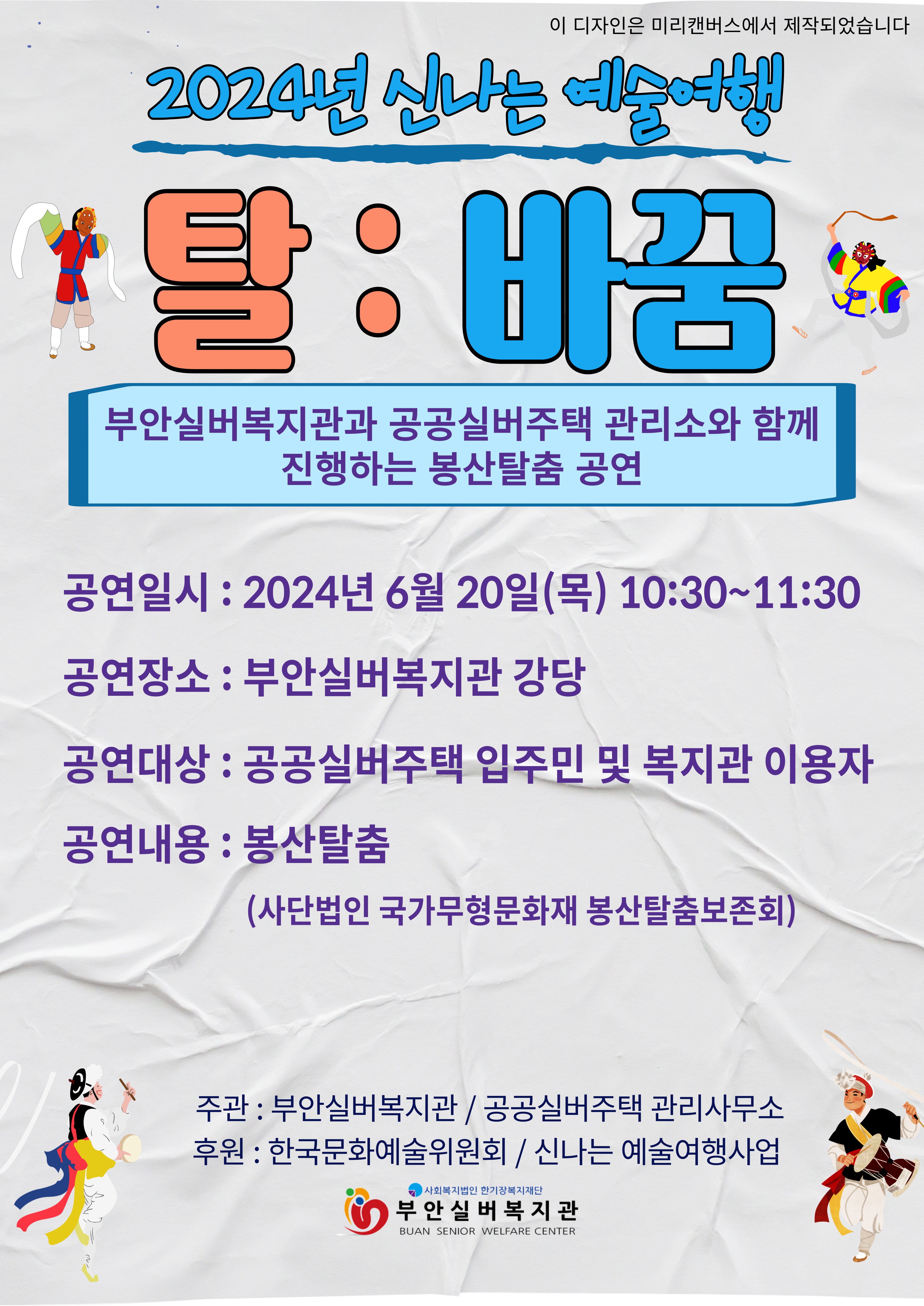 2024년 신나는 예술여행이 6월 20일 목요일 10시 30분부터 부안실버복지관 강당에서 진행됩니다.