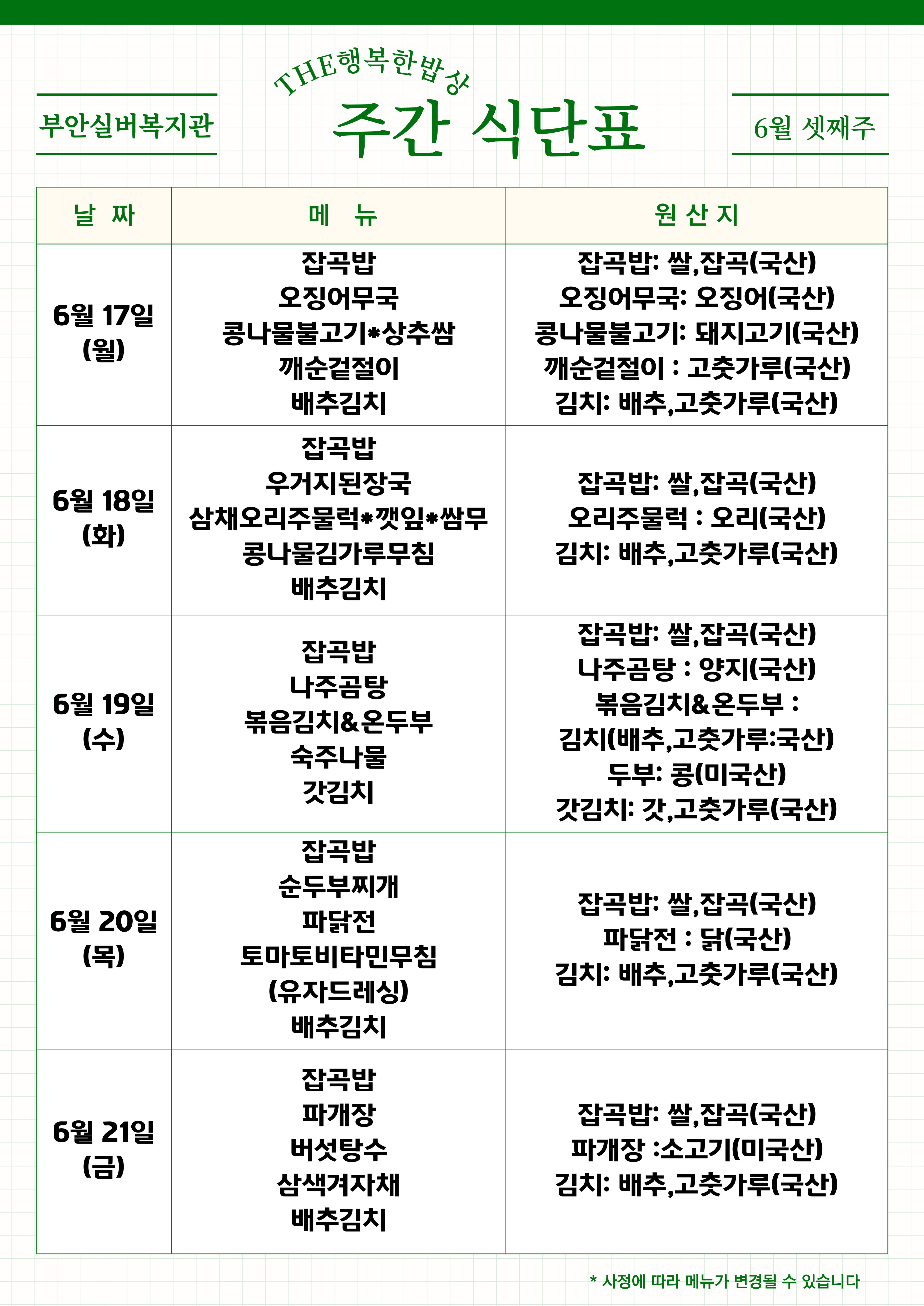 | 복지관 식단표 - 6월 3주 (0) | 2024.06.21 |