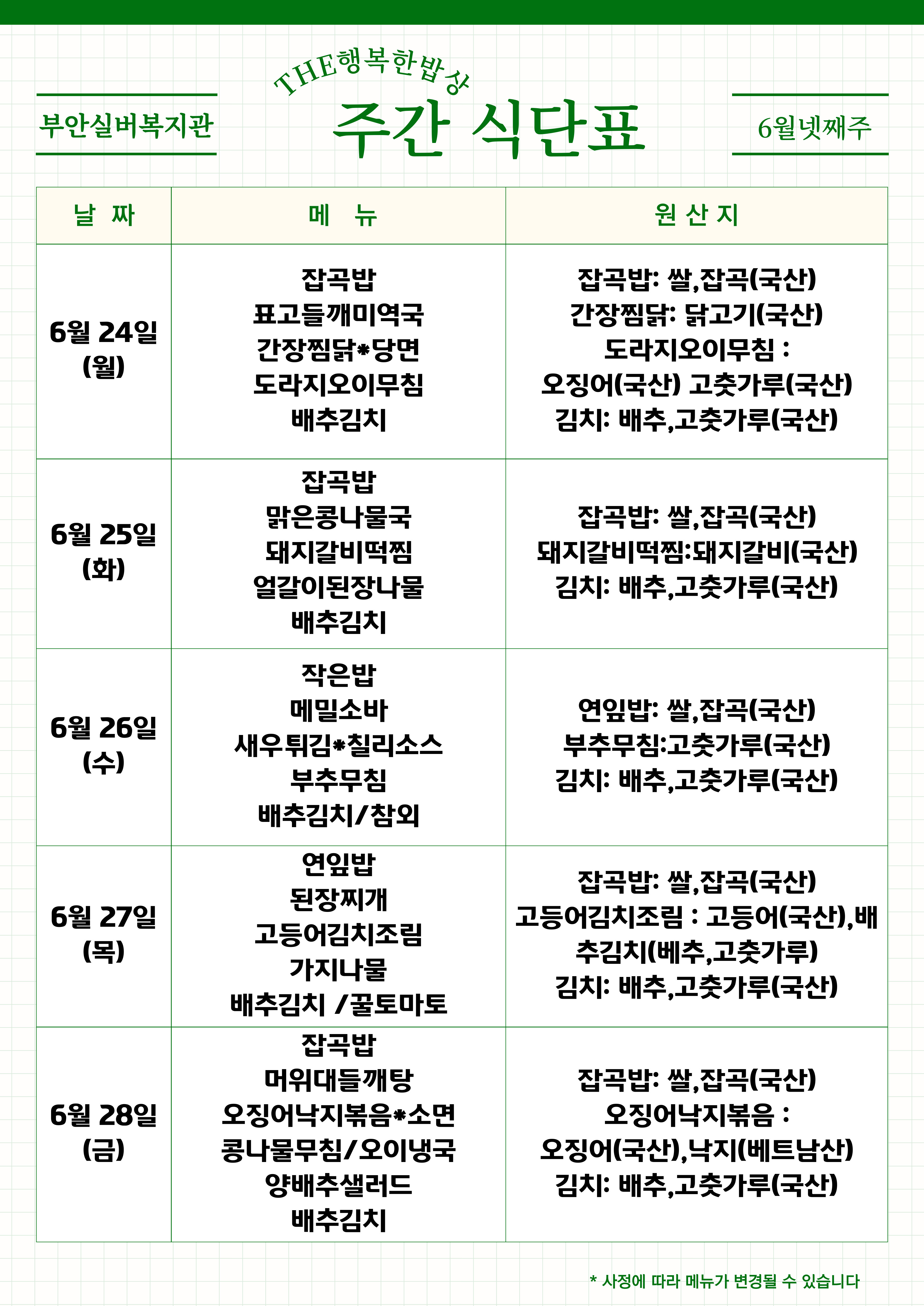 ※ 식단은 후원품 및 시장 구매 사정에 따라 변경될 수 있습니다.