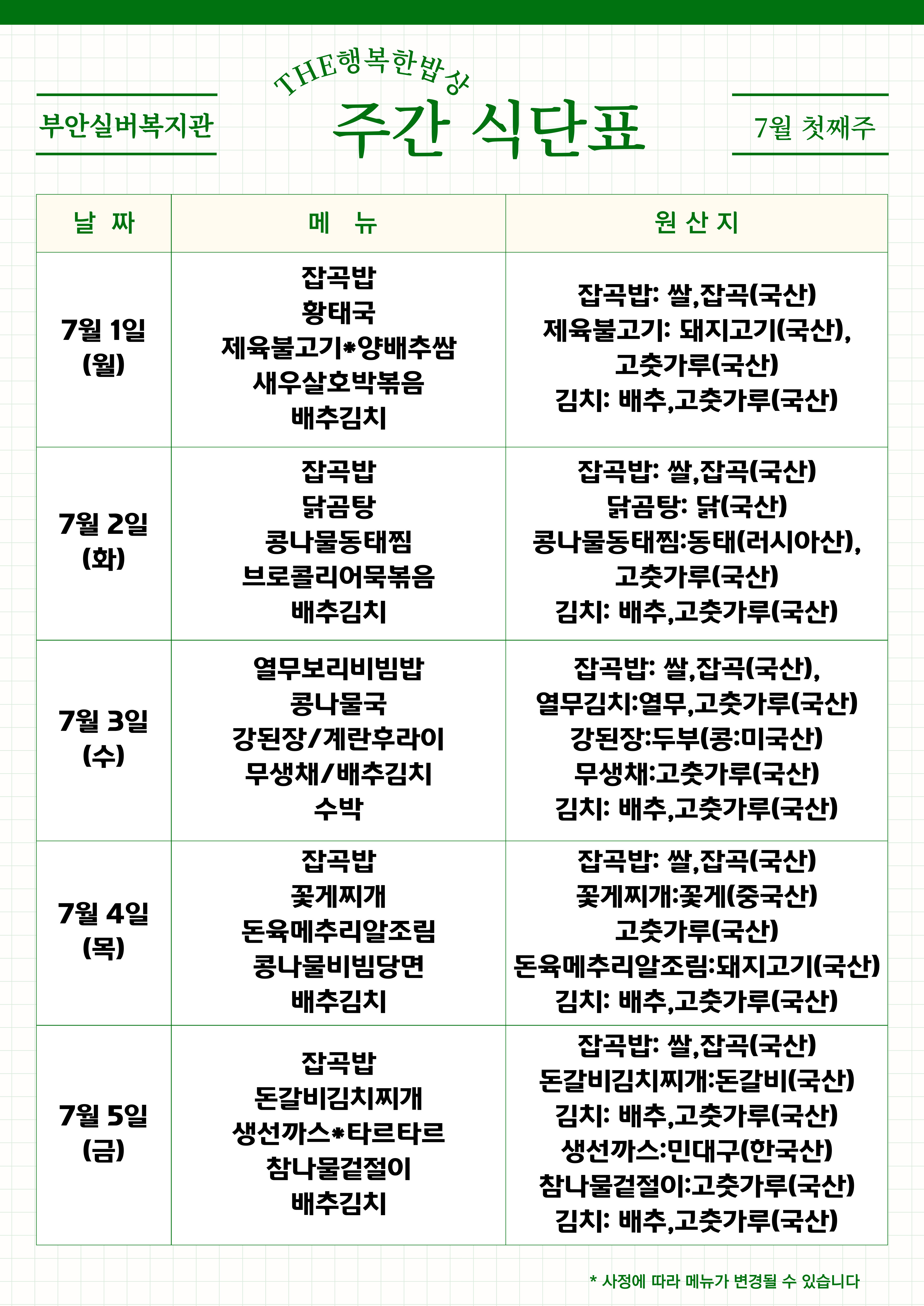 식단은 후원품 및 시장 구매 사정에 따라 변경될 수 있습니다.