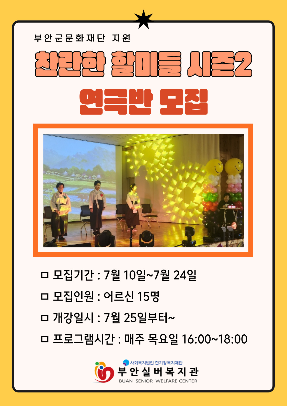 부안실버복지관에서는 부안군문화재단과 지원으로 어르신 연극 프로그램 「찬란한 할미들2」 진행합니다.
