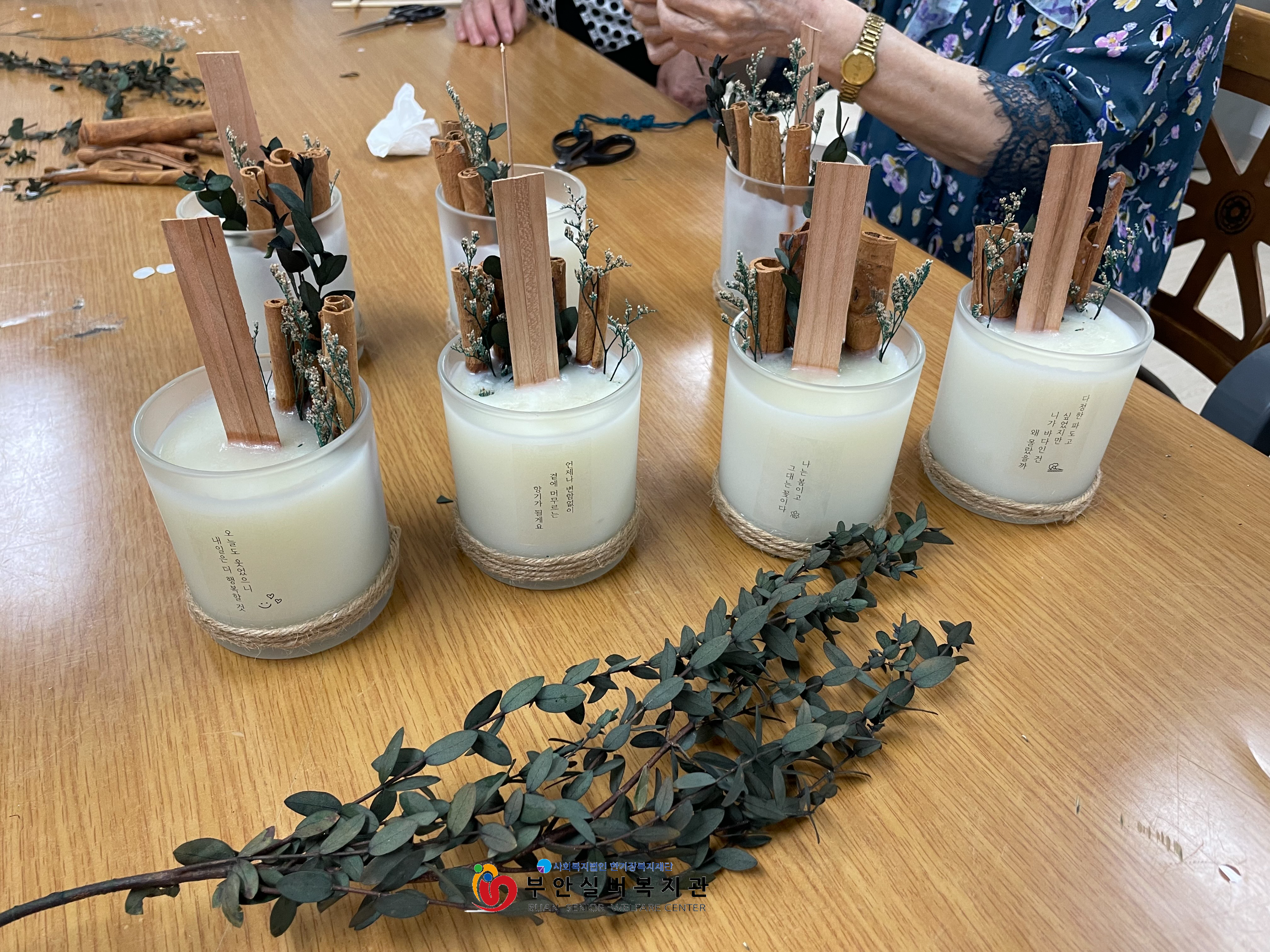 이웃관계안전망만들기 사업 거점지역(서외주공아파트) 주민 활동가들과 지난 25일 공동체 활동으로 계피 양초를 만들었습니다. 엠케이공방 이미경 선생님께서 어르신들과 함께 활동해 주셨습니다. 주민 활동가들께서는 콩으로 만든 양초라 인체에 무해하다는 이야기를 듣고 좋아하셨습니다. 주민 활동가들마다 양초를 꾸미는 모양이 다양했습니다.