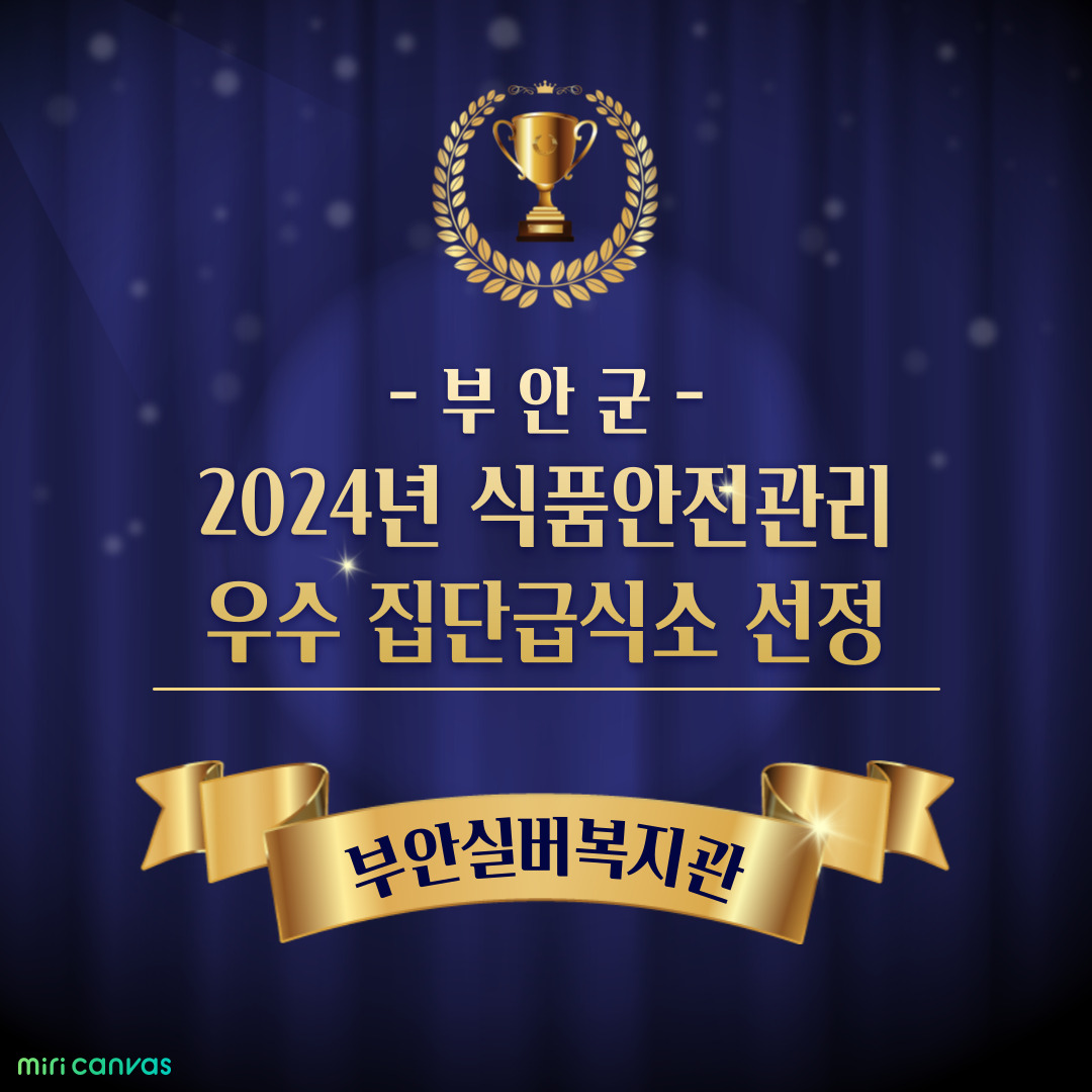 부안실버복지관 급식소 'The행복한밥상'이 부안군 2024년 식품안전관리 우수 집단급식소로 선정되는 영광을 안았습니다! 이번 선정은 부안군 내 식품안전관리의 질 향상과 식품안전성 확보를 위해 진행된 심사 결과 이루어졌으며, 이로 인해 우리 급식소는 부안군으로부터 우수 집단급식소 현판 부착 및 식중독 예방관리 물품을 지원받게 됩니다.