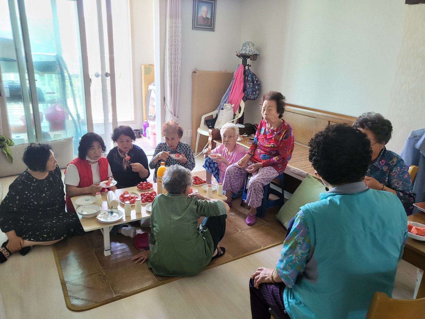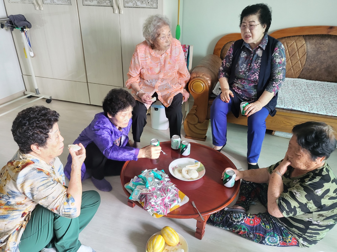 다른 층별그룹과는 달리 7층 어르신들만 모여 숫자가 적을 수도 있다 생각할 수 있지만, 병원에 입원하거나 멀리 출타하지 않으면 10세대 중 9세대가 모이십니다. 참여하지 않는 남성 어르신의 소식도 물론 전달해 주십니다. 나이가 적으면 동생, 많으면 형님, 같으면 친구! 서로를 챙기고 아끼는 모양새가 멀리 사는 형제들보다 나아 보입니다. 어르신들도 '우리는 형제지간'이라 하십니다. 김0님 어르신 댁이 사랑방이 되어 6월, 7월 수다를 떨었습니다. 집집마다 사정을 누구보다 잘 알고 계십니다. 가져온 간식이 남으면 젊은 동생이 골고루 싸서 함께 나누어 갑니다. 서로를 챙기는 모습이 아름답습니다.