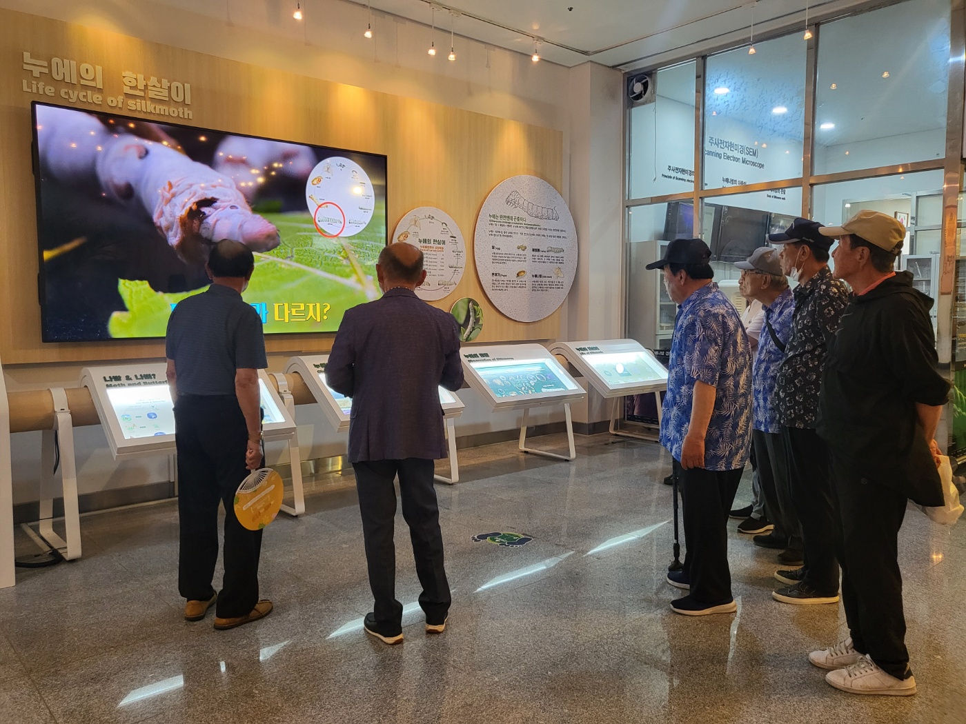 부안 역사 탐방을 하고 있는 어르신들이 6월에는 새만금 간척박물관에서 한국 간척 역사와 세계 간척 역사에 대한 설명을 들었습니다. 새만금 간척 사업에 대한 어르신들의 생생한 경험을 이야기 했고, 많은 세계 간척 역사 전시물이 있는 박물관의 규모에 놀라기도 했습니다. 7월에는 변산 유유동에 있는 누에타운을 방문하여 부안의 누에 생산에 관해 알아보았습니다. 특히 부안이 조선후기 발간된 김정희의 '대동여지도'에 누에 생산지로 표시될 만큼 유명한 곳이었으며 현재는 생산, 가공, 판매를 아우르는 6차산업으로 발전되었다는 해설사의 설명에 어르신들은 부안의 또 하나의 자랑거리라 이야기 하십니다. 부안의 역사를 공부하고 후배세대들에게 알리고 싶은 마음을 느낄 수 있는 시간이었습니다.