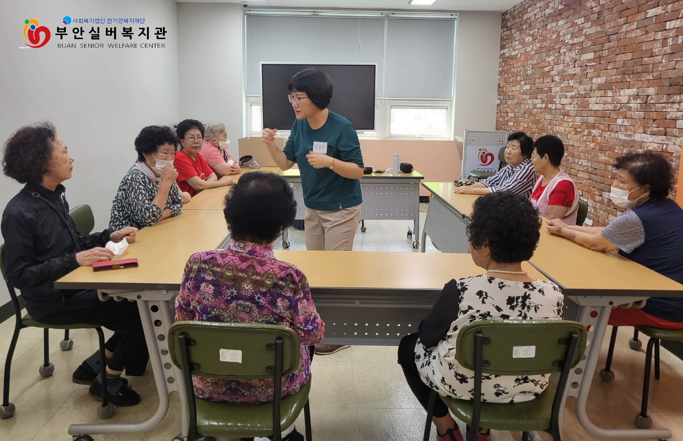 부안실버복지관에서는 공공실버주택 어르신들과 '고마운 이웃사촌'이라는 주제로 8월 1일부터 5일까지 노인집단 상담 프로그램을 층별 그룹활동으로 진행하였습니다. 김윤희 전문상담사와 함께 살아온 자신의 이야기와 고마운 이웃에게 감사의 마음을 전하고, 케이크에 얼굴을 그리는 활동을 통해 이웃의 소중함을 다시 한번 깨닫는 자리가 되었습니다.