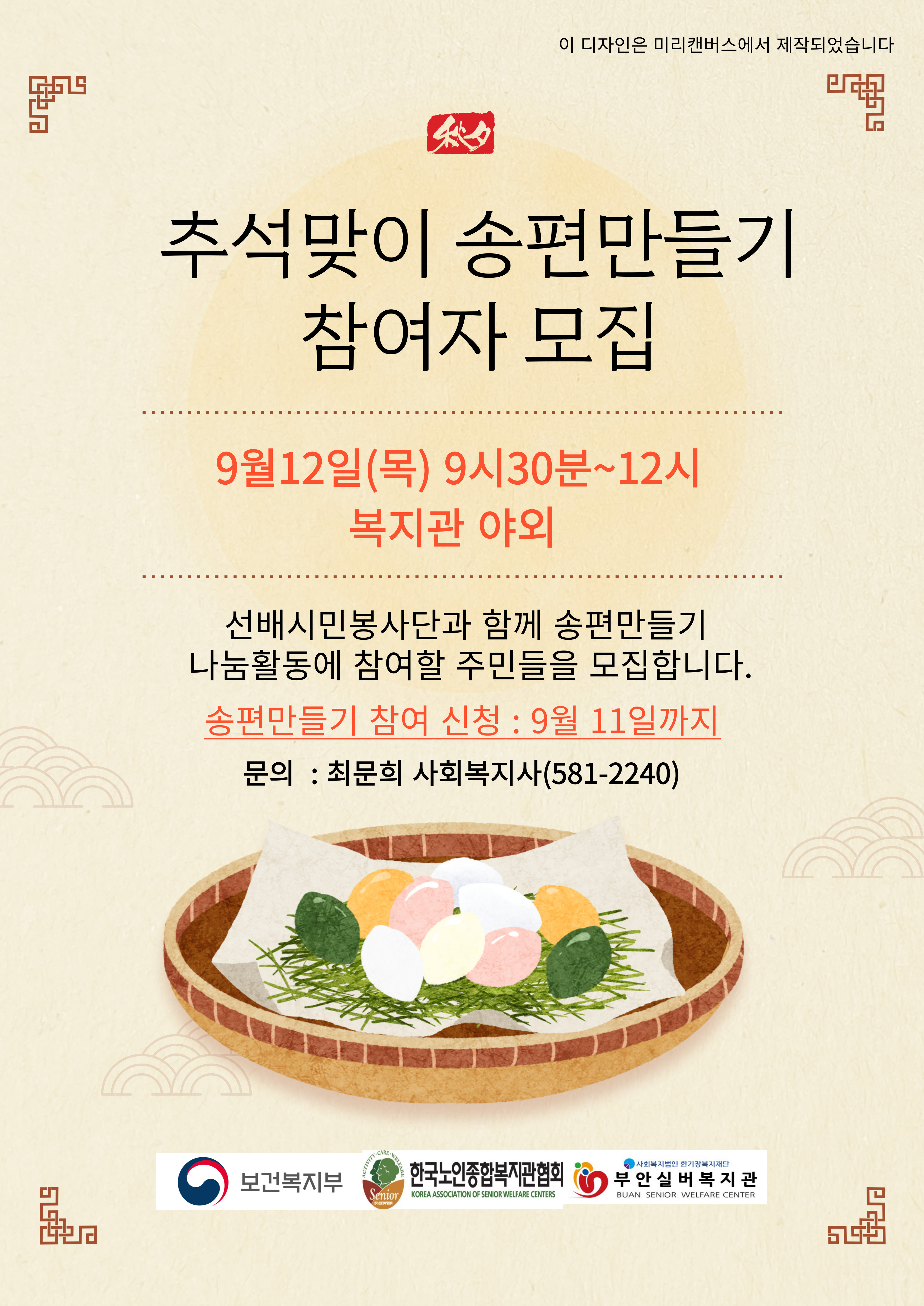 어르신들과 함께 송편을 만들고 나누어 행복한 추석을 보내려 합니다.