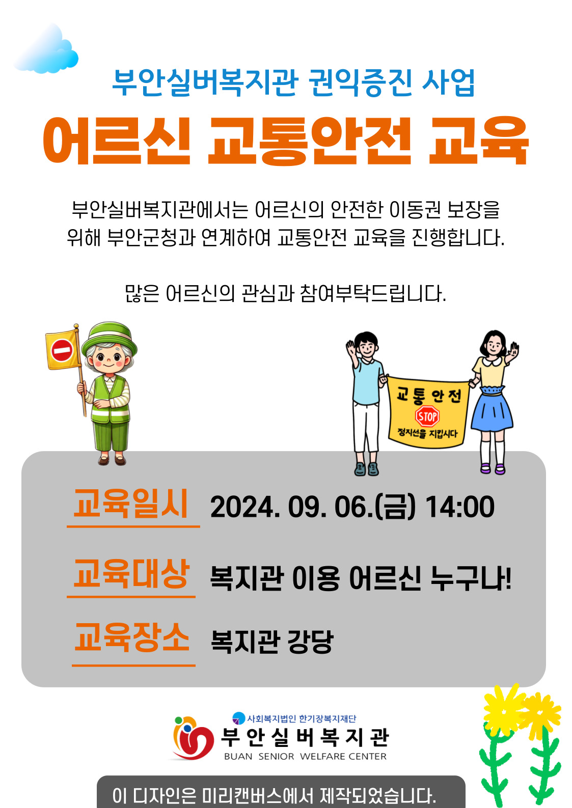부안실버복지관에서는 어르신의 안전한 이동권 보장을 위해 부안군청과 연계하여 교통안전 교육을 진행합니다.