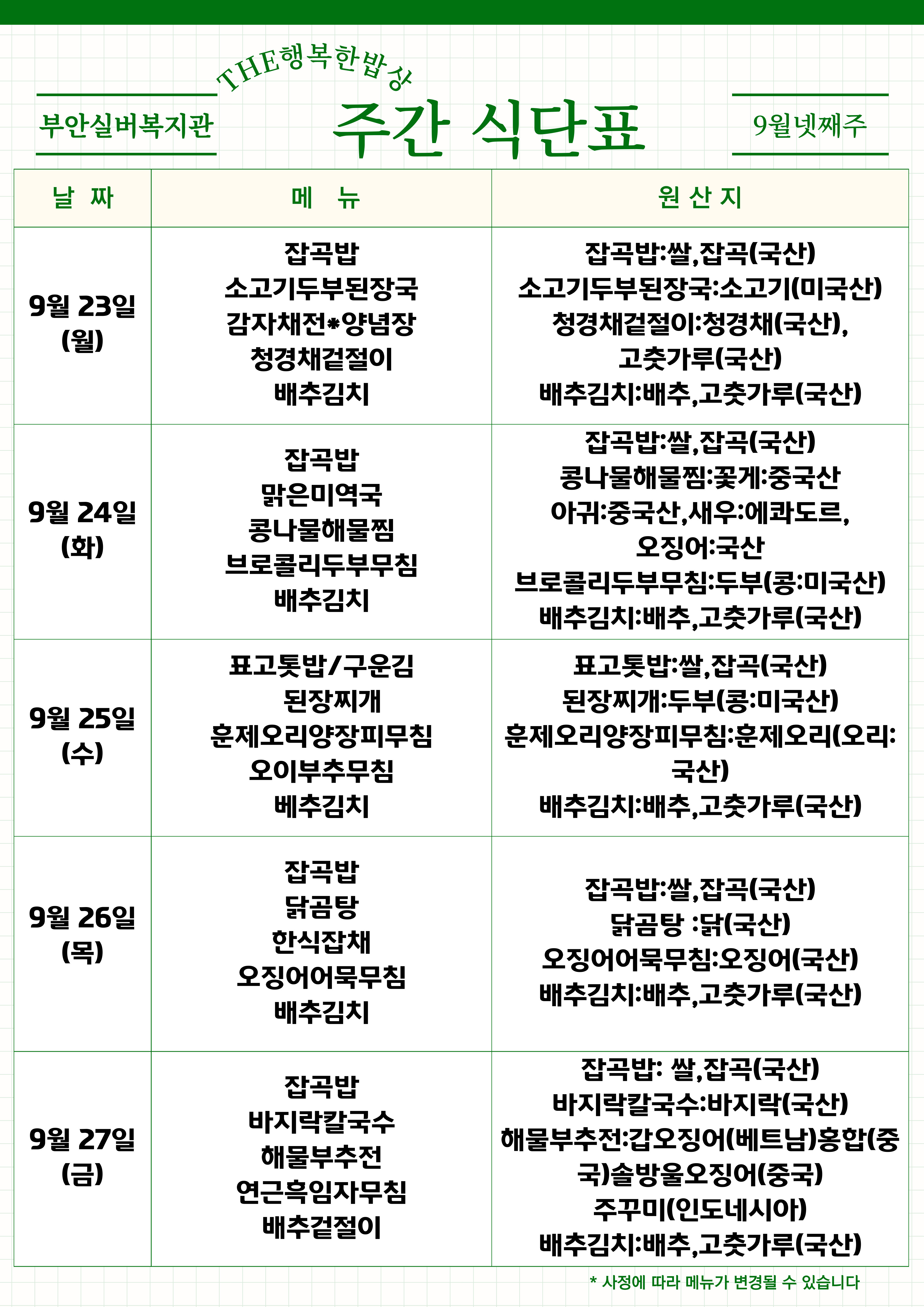 | 복지관 식단표 - 9월 2주 (1) | 2024.09.06 |