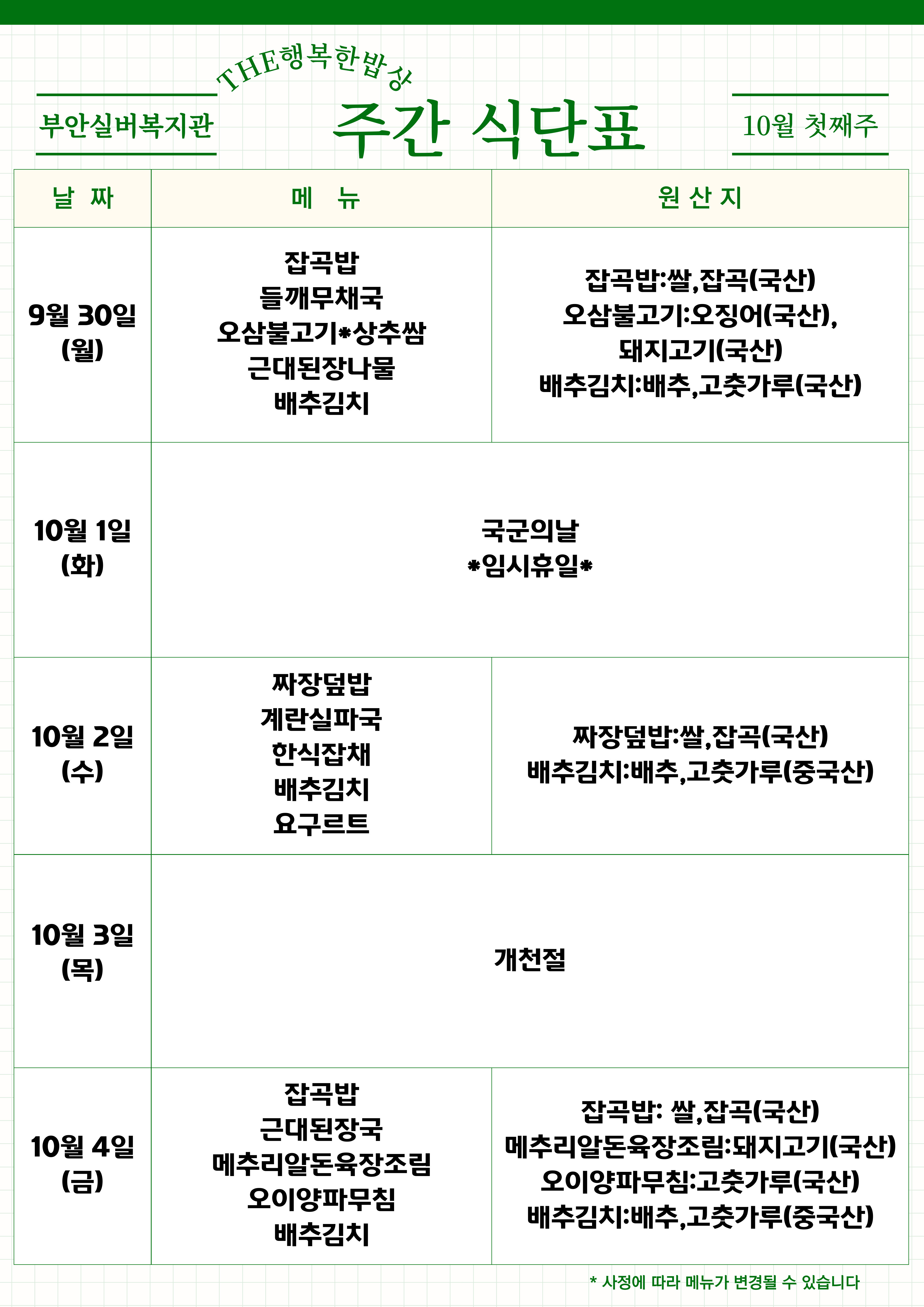 | 복지관 식단표 - 10월 3주 (1) | 2024.10.11 |