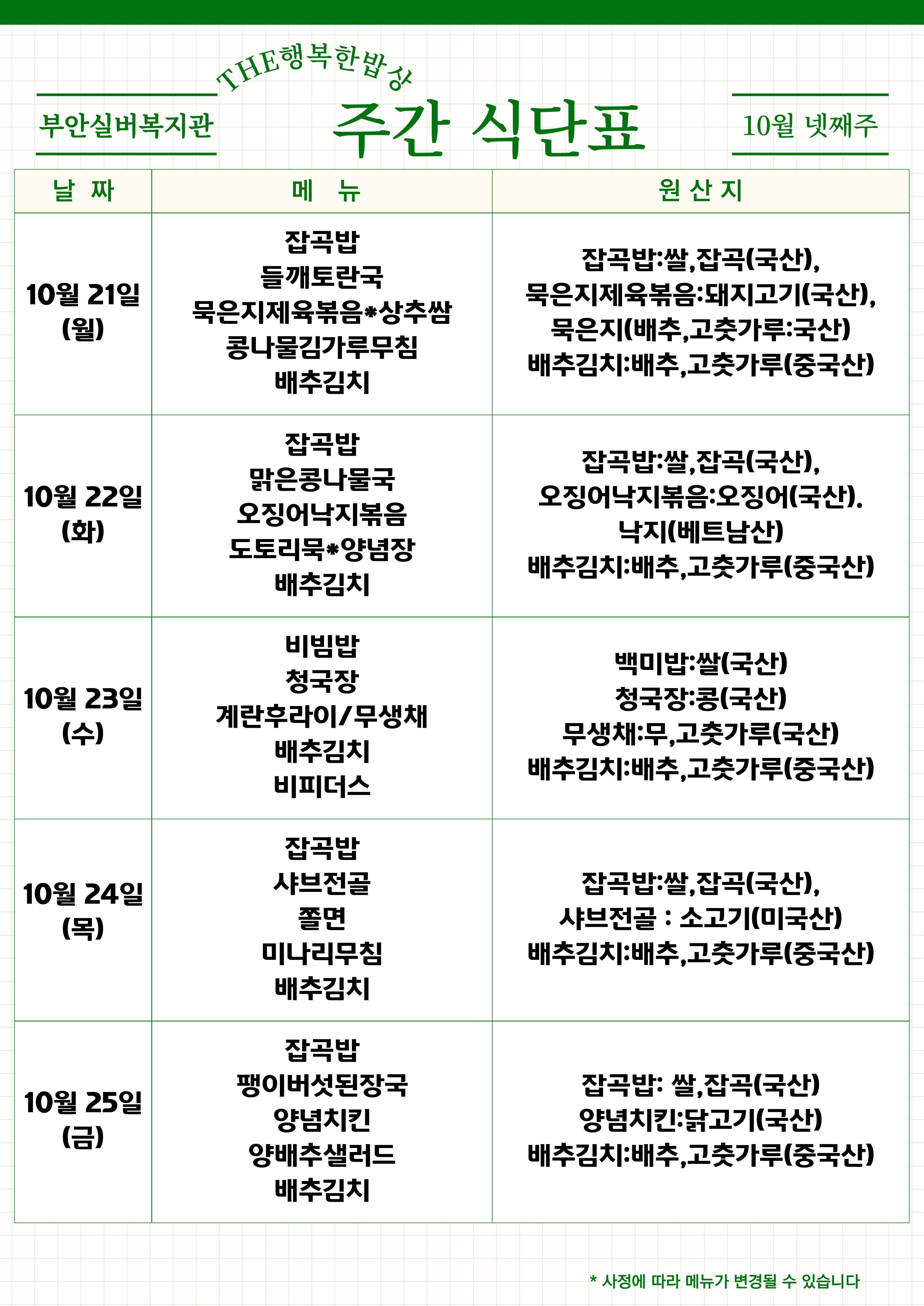 | 복지관 식단표 - 10월 3주 (1) | 2024.10.11 |