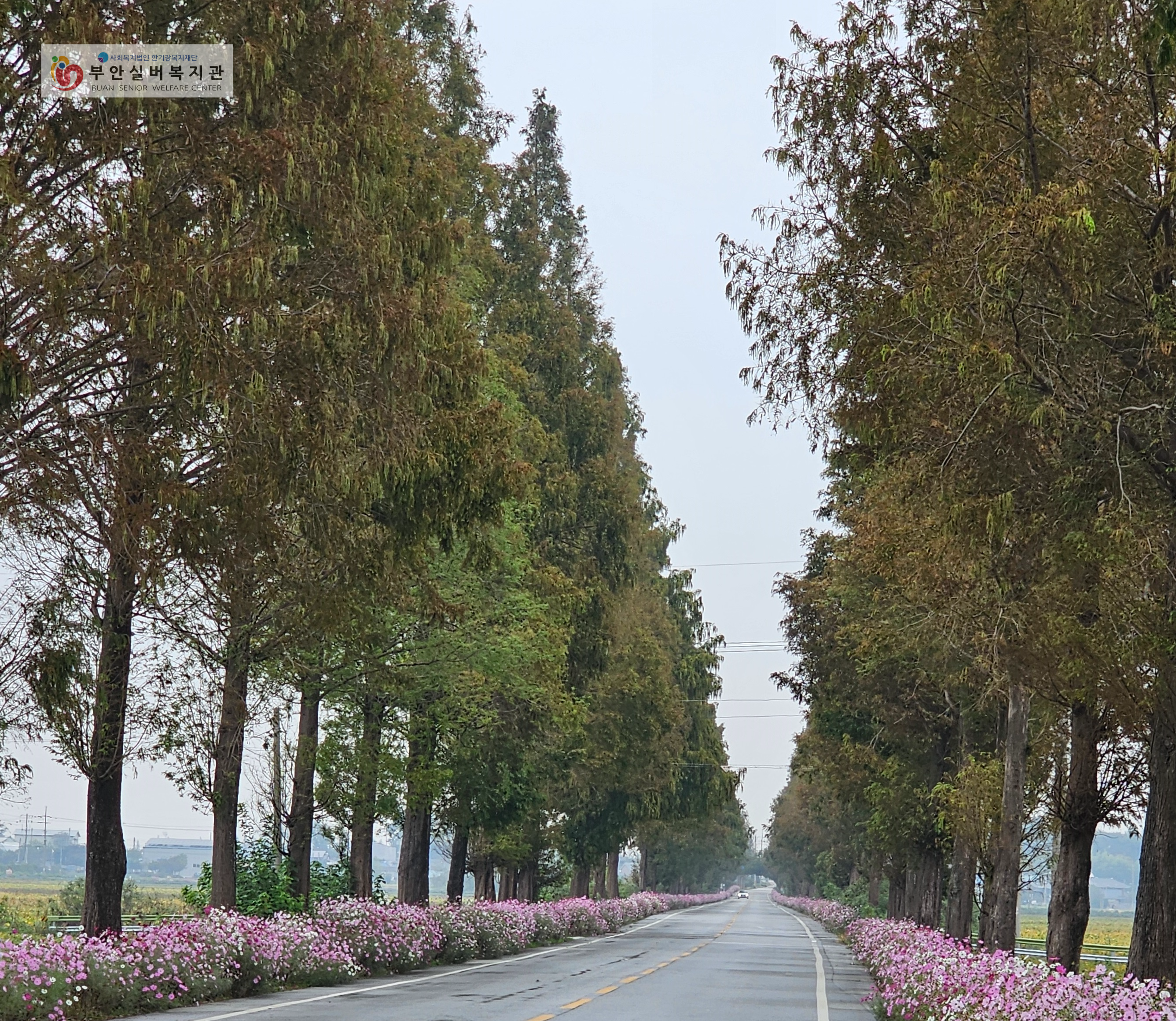 10월 수업으로 김제 메타세콰이어 길과 망해사에 다녀왔습니다! 김제 메타세콰이어 길은 연중 큰 나무들이 장관을 이루지만, 이 시기에 가면 코스모스가 나무 사이사이를 메워서 아는 사람만 아는 예쁜 명소입니다. 어르신들은 날씨가 흐려서 걱정하셨지만, 메타세콰이어 나무와 만개한 코스모스를 보며 "그래도 오길 잘했다."라고 이야기하며 사진촬영을 하셨습니다.