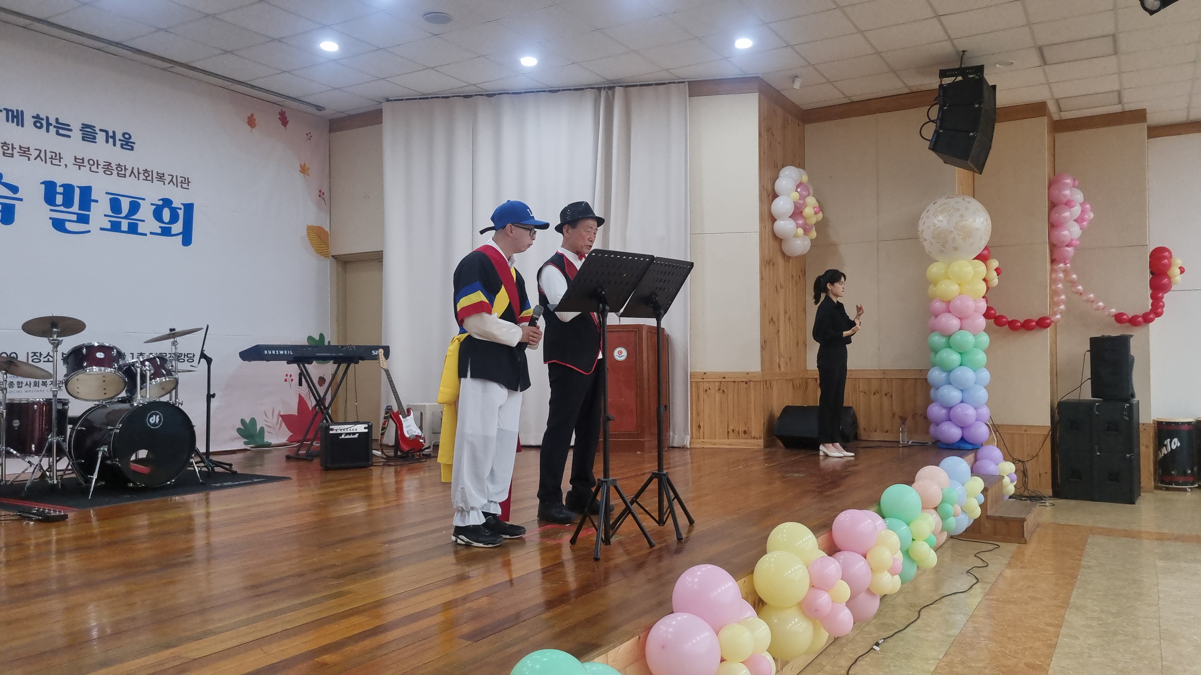 부안복지관의 신나는 사물놀이 공연으로 평생학습 발표회 시작을 알리고, 어르신과 장애인 대표 두 분이 1년 동안 각 복지관을 이용하면서 즐겁고 행복했던 느낌을 공유하며, 평생학습 발표회 개회를 선포했습니다.