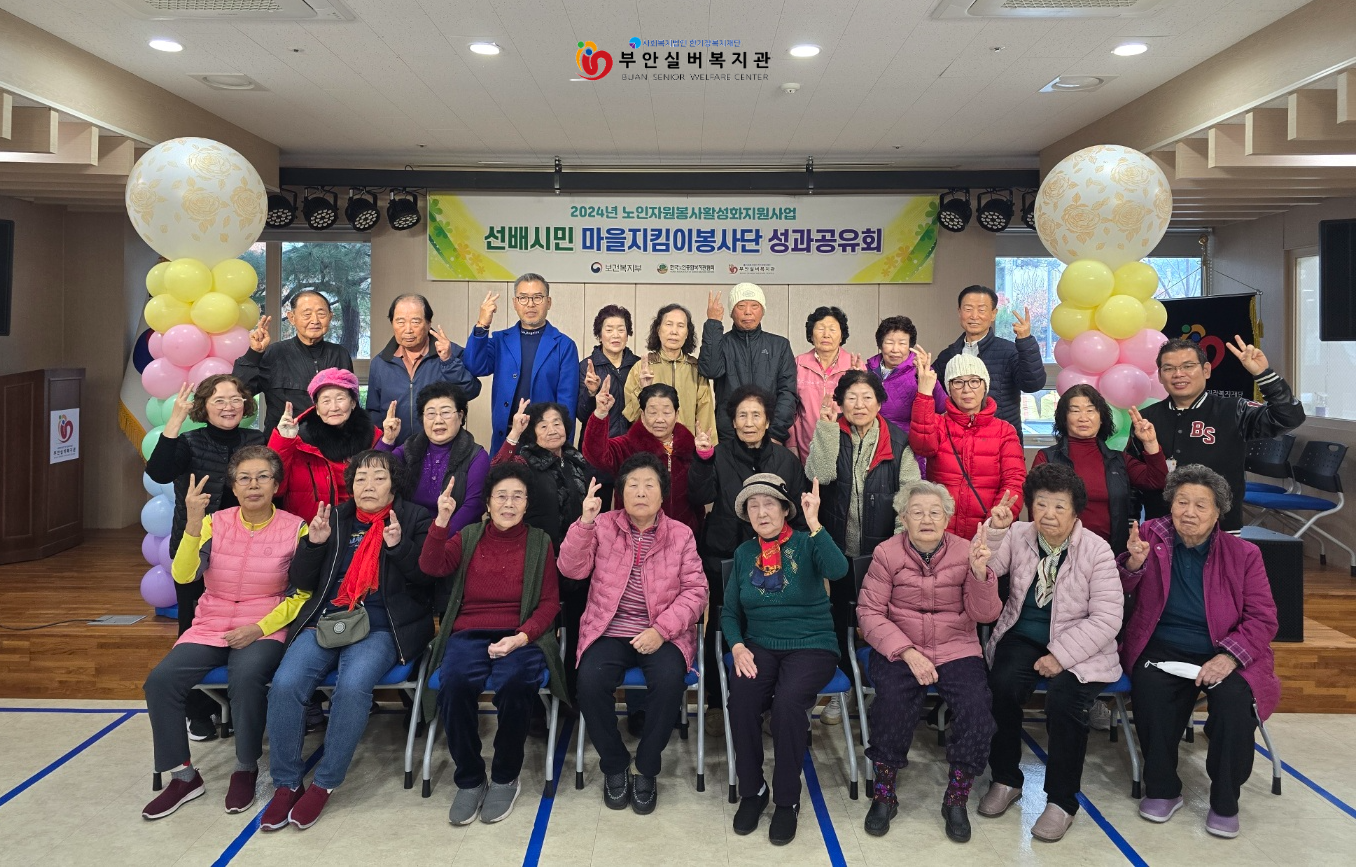 부안실버복지관에서는 11월29일(금) 선배시민 '마을지킴이봉사단' 성과 공유회를 열었습니다. 24명의 봉사단원이 참석하여 지난 1년간 봉사활동을 되돌아 보며 소감을 나누고 내년 활동에 대한 각오를 나누었습니다.