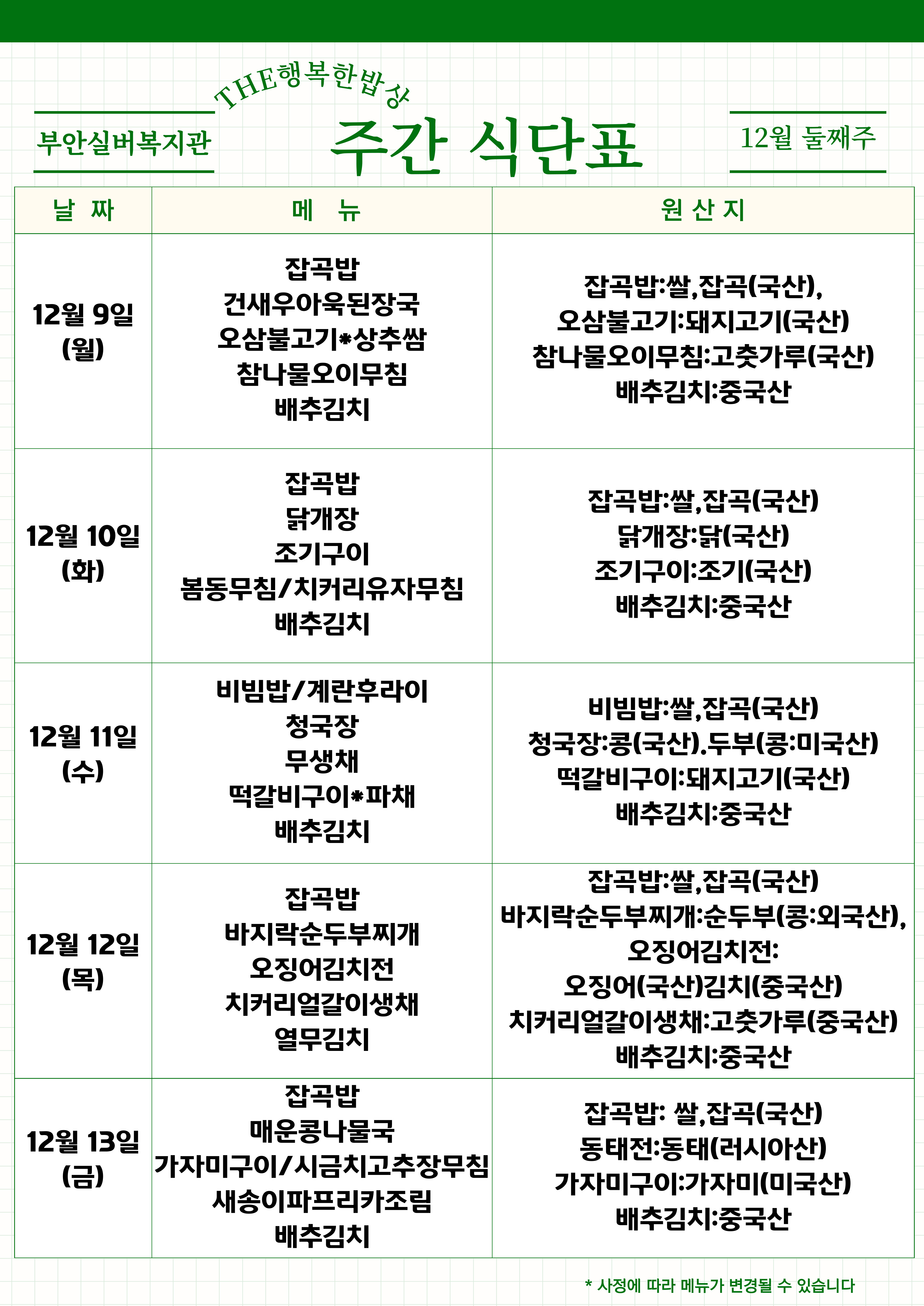 ** 위 식단은 식재료 수급 사정에 따라 변경 될 수 있습니다.