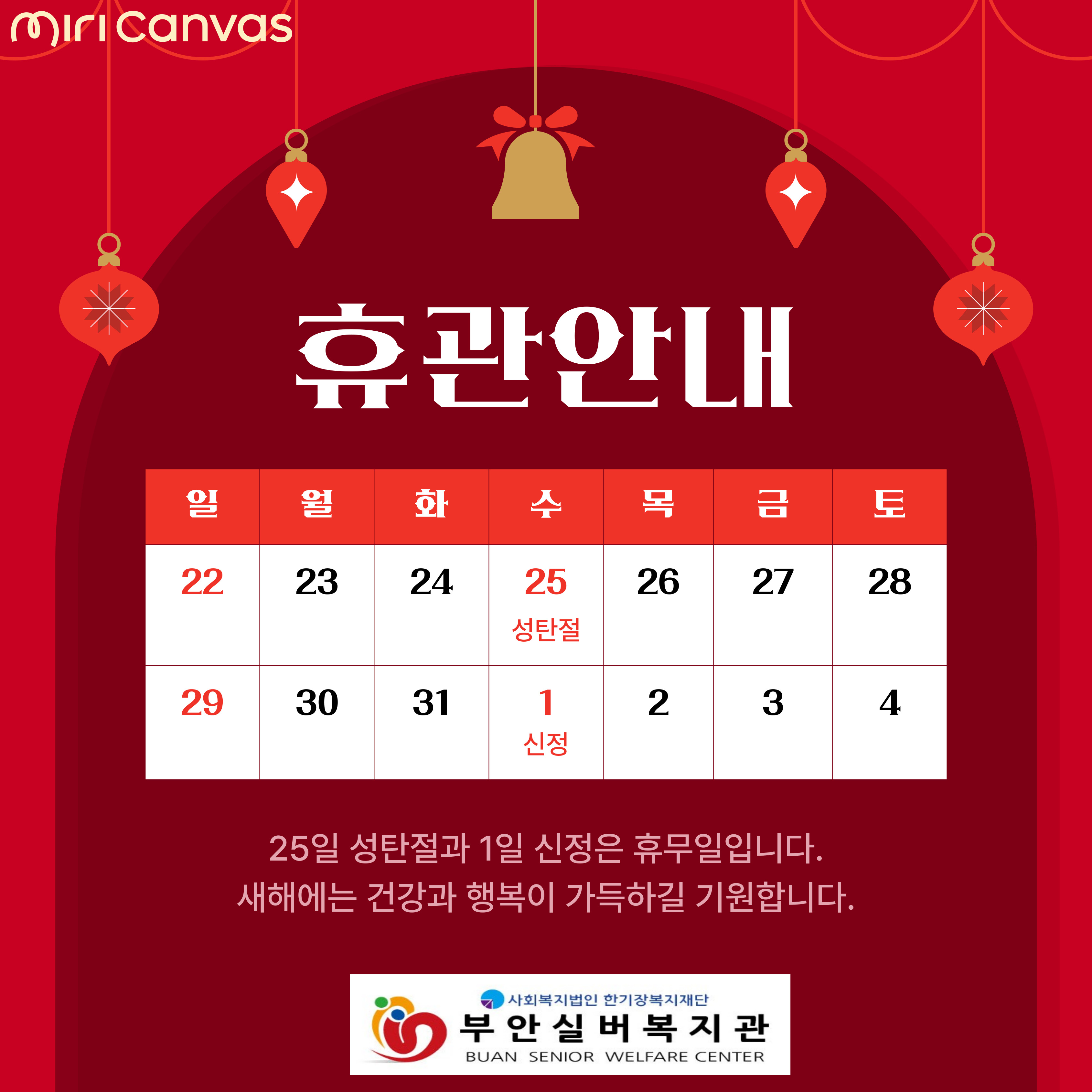 12월 25일(성탄절), 1월 1일(신정)은 공휴일로