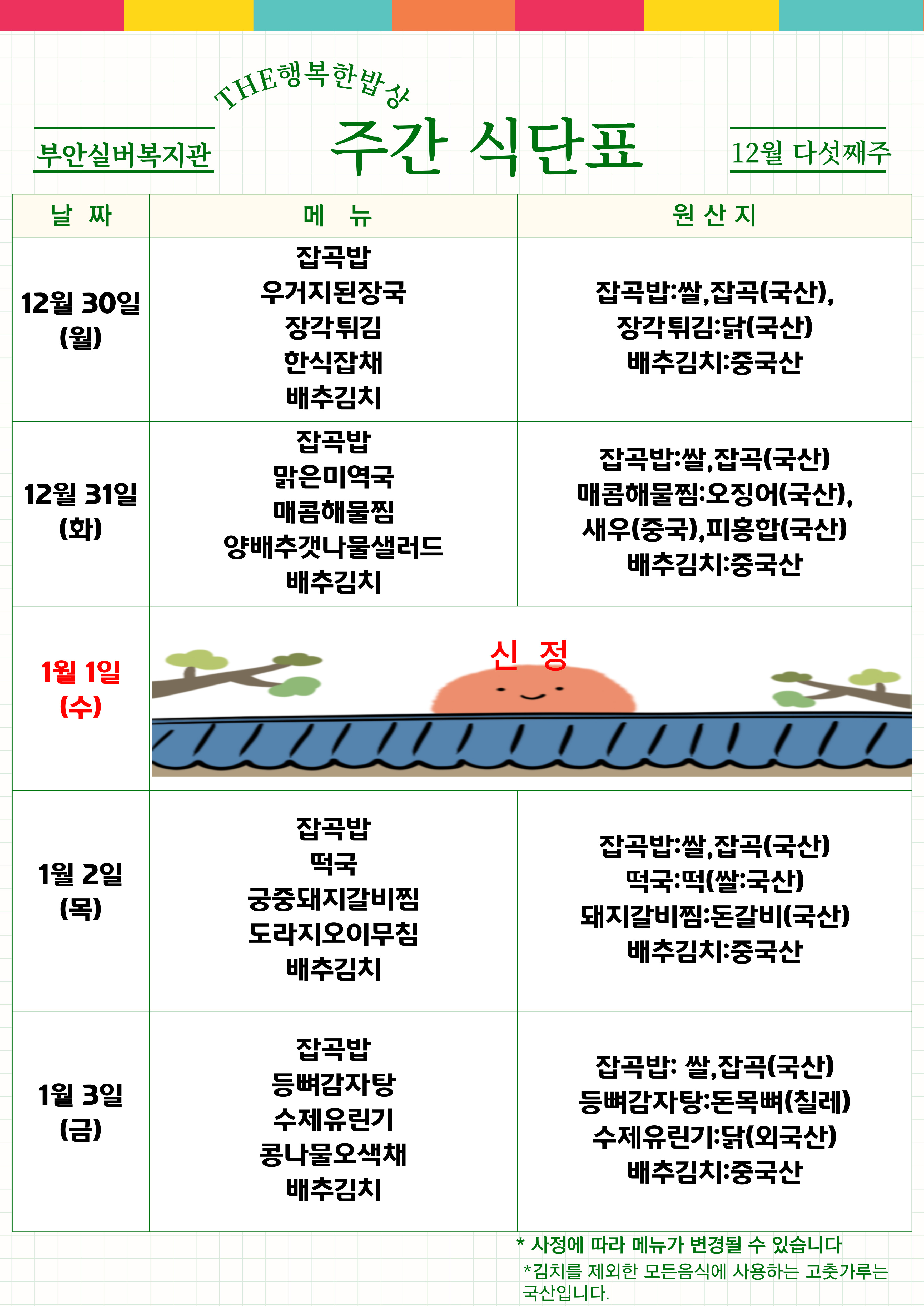 | 복지관 식단표 - 1월 2주 (0) | 2025.01.14 |