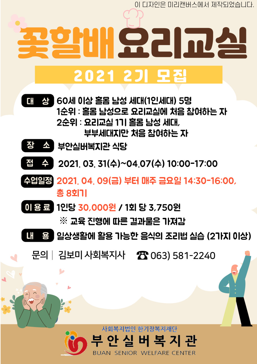 | 어르신 평생학습 프로그램 추가 모집 안내 (0) | 2021.03.05 |